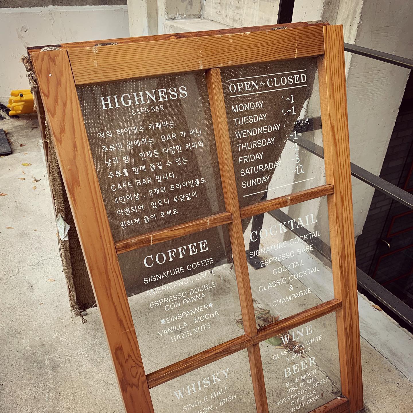 그럴 때면, 우리 커플은 잘 걷지 않던 골목으로 방향을 선회하고는 하는데, 합정 분위기 있는 카페겸 칵테일바인 하이네스(Highness)도 그렇게 우연히 맞닥뜨린 곳이었다.