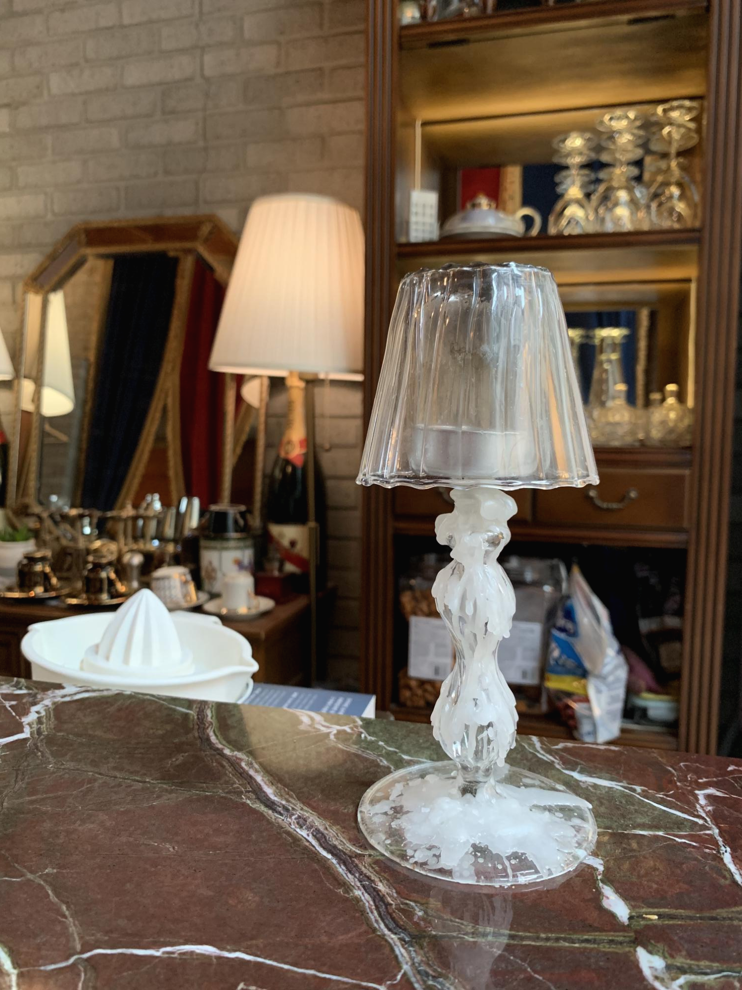 고전 방식의 유리 가공법으로 만든 양초 스탠드. 좀 더 어두울 때 다시 보고 싶은 분위기 있는 소품이다.