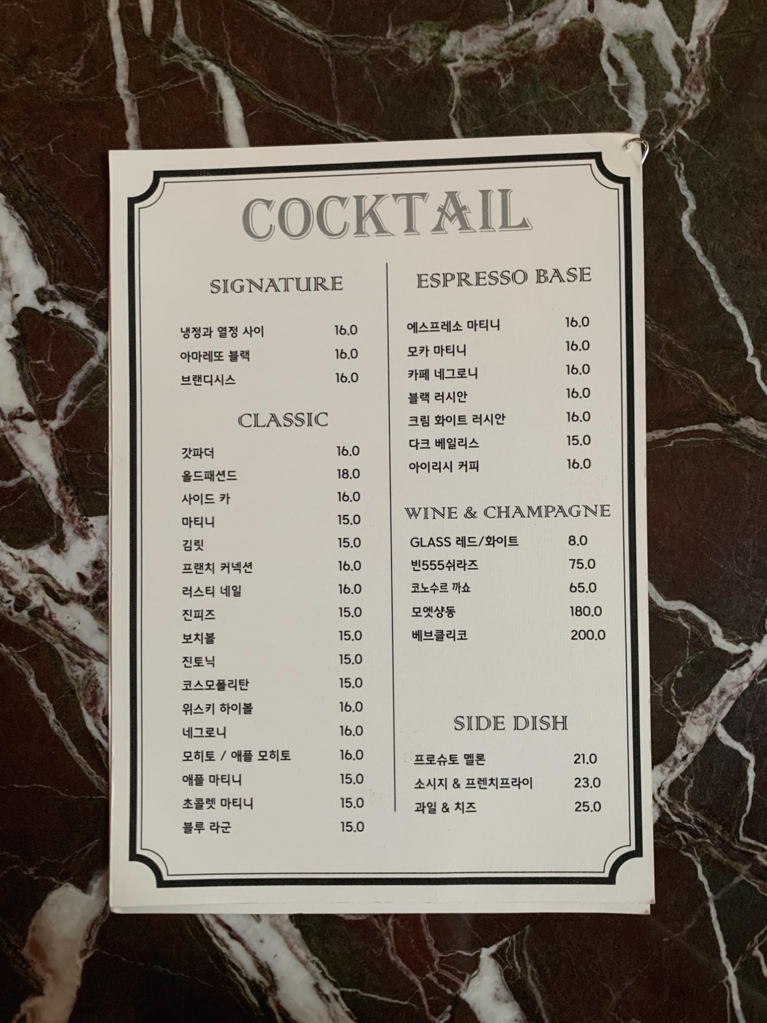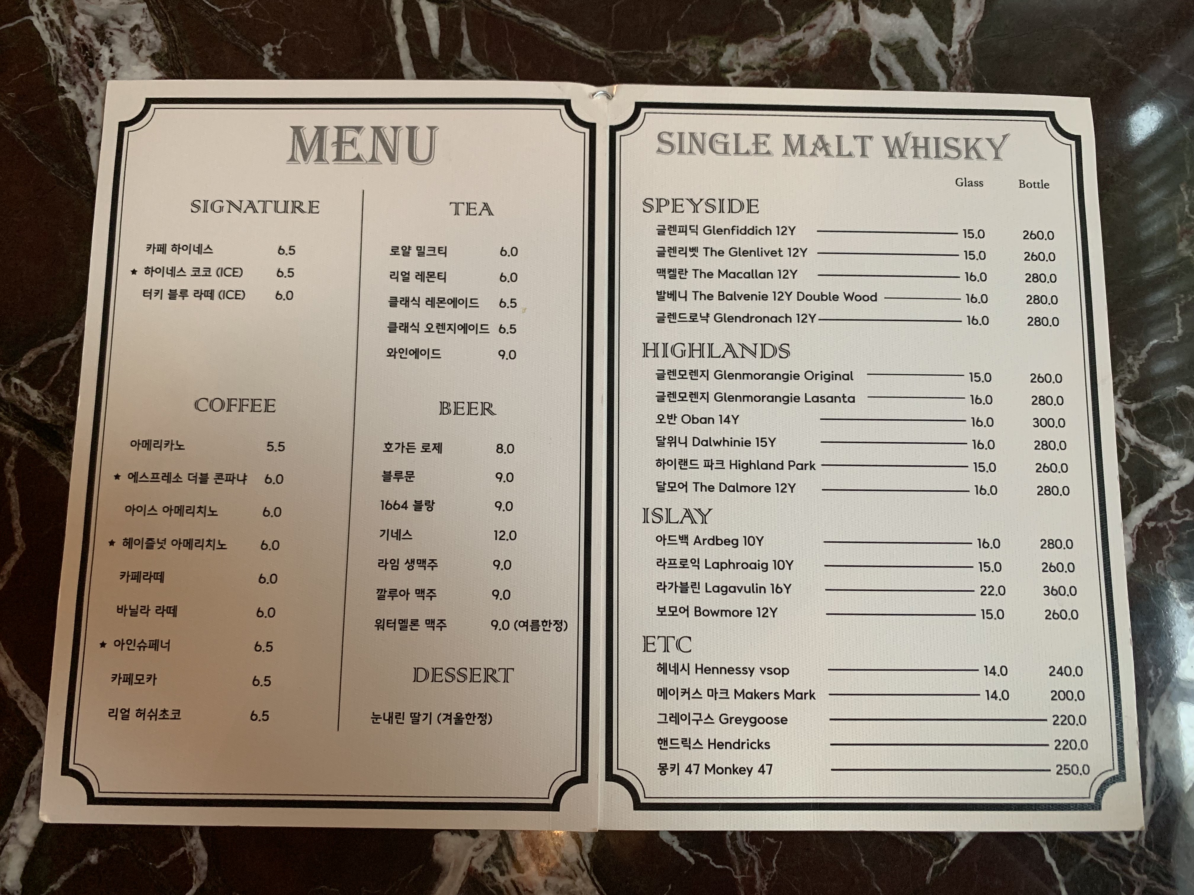 커피와 칵테일 모두 시그니처 메뉴가 구비되어 있을 뿐 아니라 짙은 풍미의 리큐르들도 다수 구비되어 있어 매니아 층도 자주 들를 수 있을 것 같다. 겨울 한정이라는 저 눈 내린 딸기를 먹어 보러 겨울에도 꼭 다시 한번 들를 생각이다. 이태원에서 갔던 곳들보다도 훨씬 가격이 저렴해서 깜짝 놀랐다. 가격 경쟁력 무엇?!