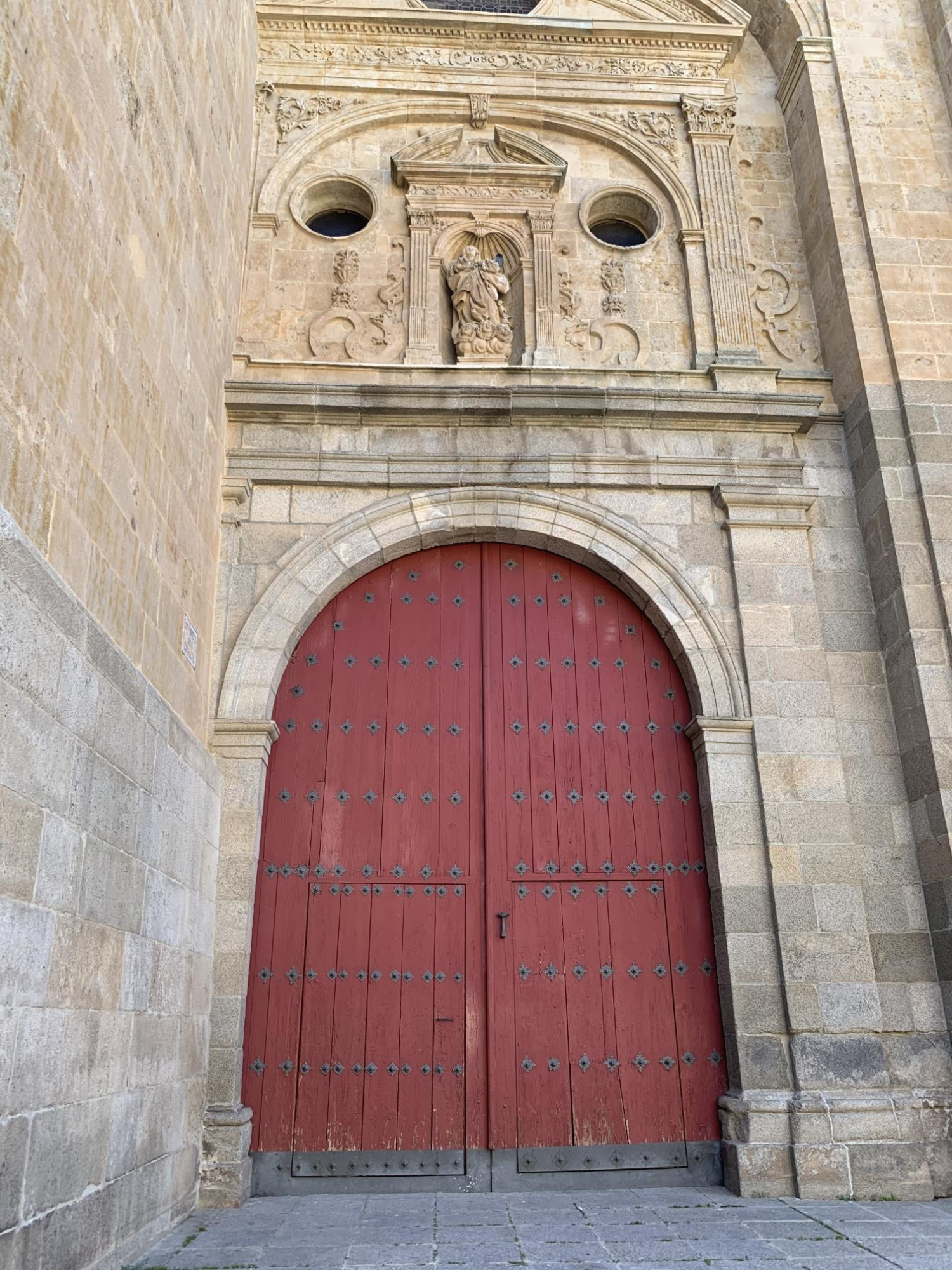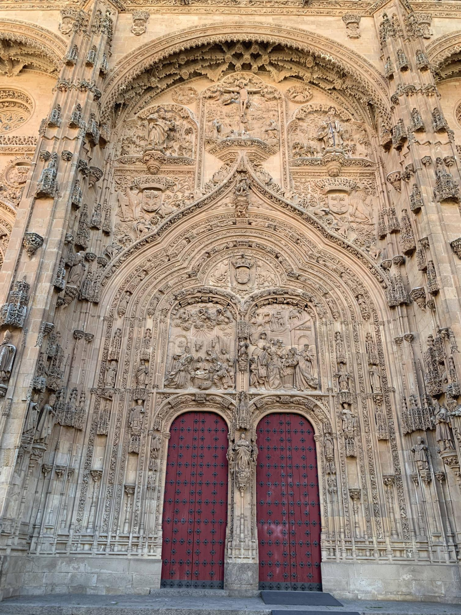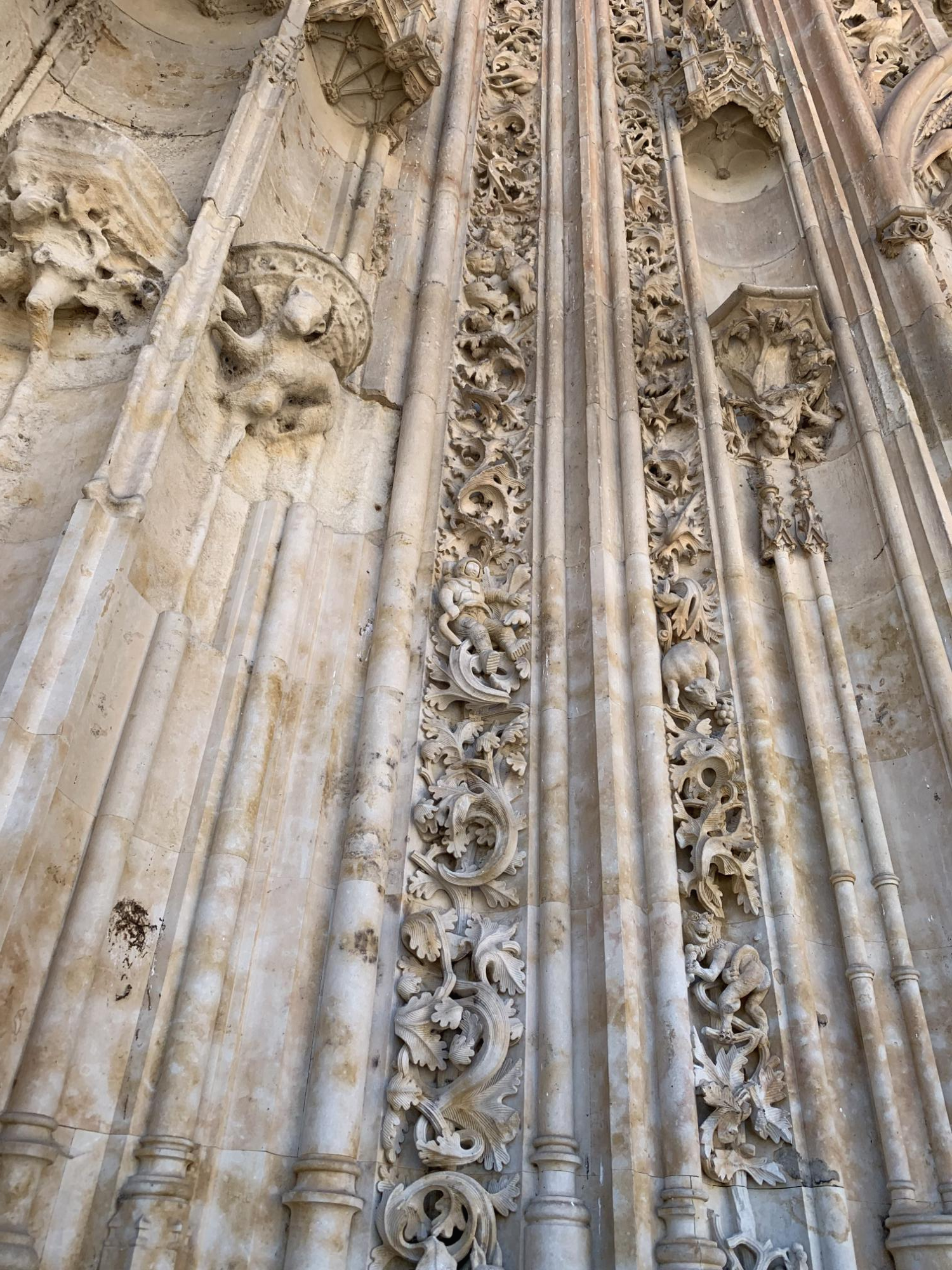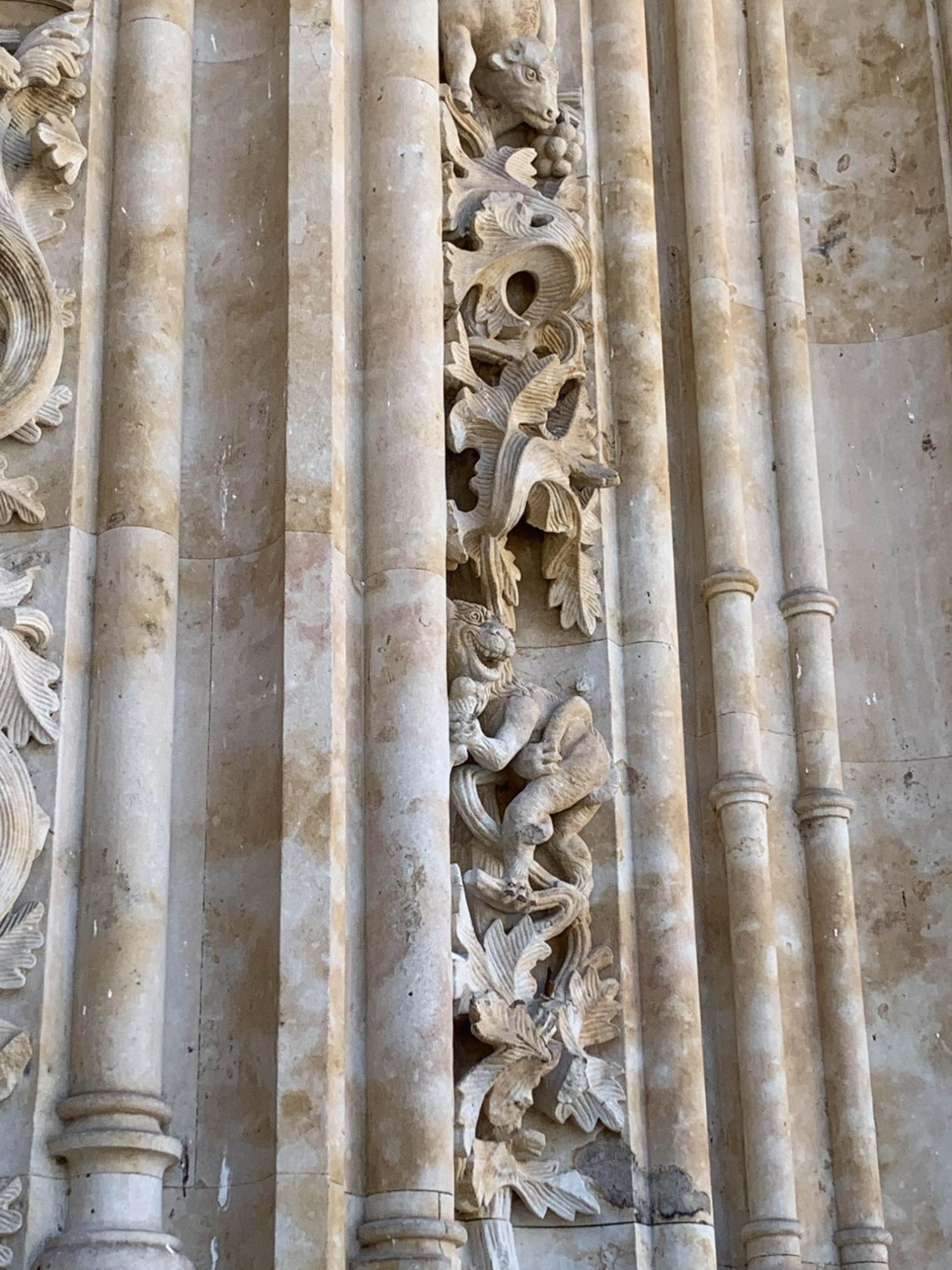 대성당의 전면으로 오면, 불가사의한 문양들을 가까이 보려는 관광객들이 자리하고 있다. 실로 미스터리 한데, 16세기에서 18세기에 걸쳐 지어진 대성당(12세기 로마네스크 양식으로 지어진 비에하 구 대성당은 살라망카 대학 동남쪽에 따로 위치하고 있으며, 이날 관광은 누에보 신 대성당에서 진행)에 우주복을 입은 우주인과 젤라또 콘을 든 짐승의 모습이 조각되어 있다고 한다. 이게 무슨 말인가? 할 것이다.