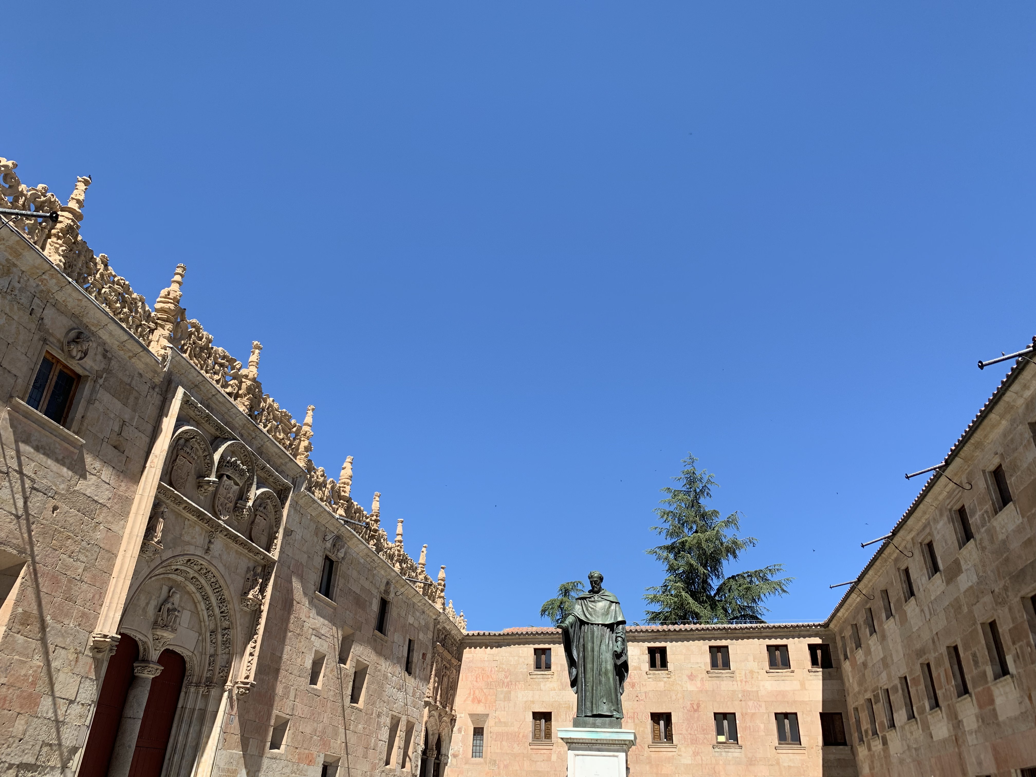 정문 뒤편으로 보이는 살라망카 대학의 정원. 이 대학 출신이자 1561년에 신학대학 교수가 된 시인, 루이스 데 레온의 석상이 정원을 보호하듯 내려다보고 있다.