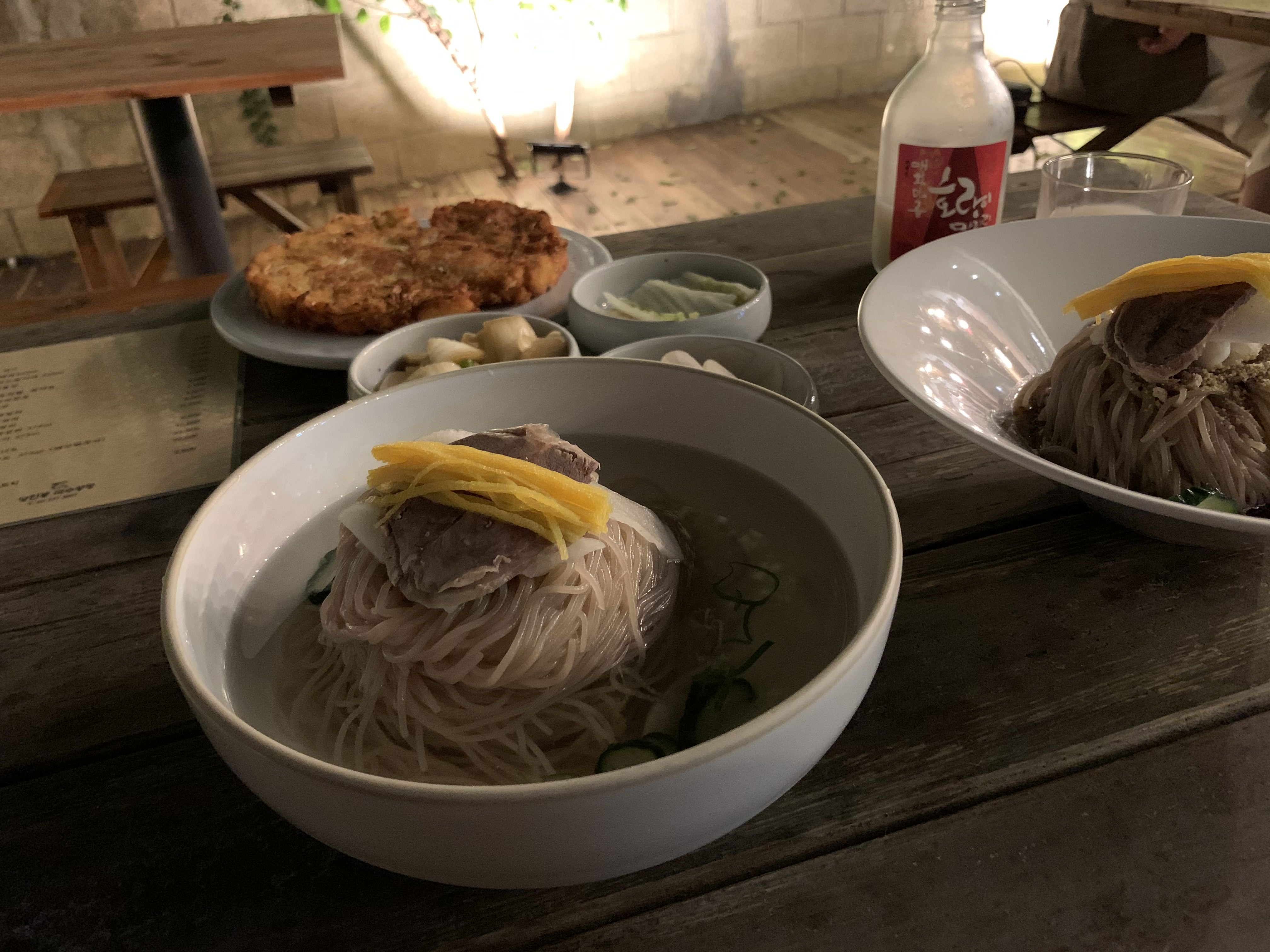 정통 메밀면을 평양냉면식으로 담아낸 당인냉면과 향긋한 들기름 메밀면을 주문했다. 날이 너무 좋아 호랑이막걸리 한 병과 곁들일 녹두전도 하나 추가 주문하기로 했다. 당인냉면은 7000원, 들기름 메밀면과 녹두전은 8000원으로 저렴한 가격을 자랑한다.