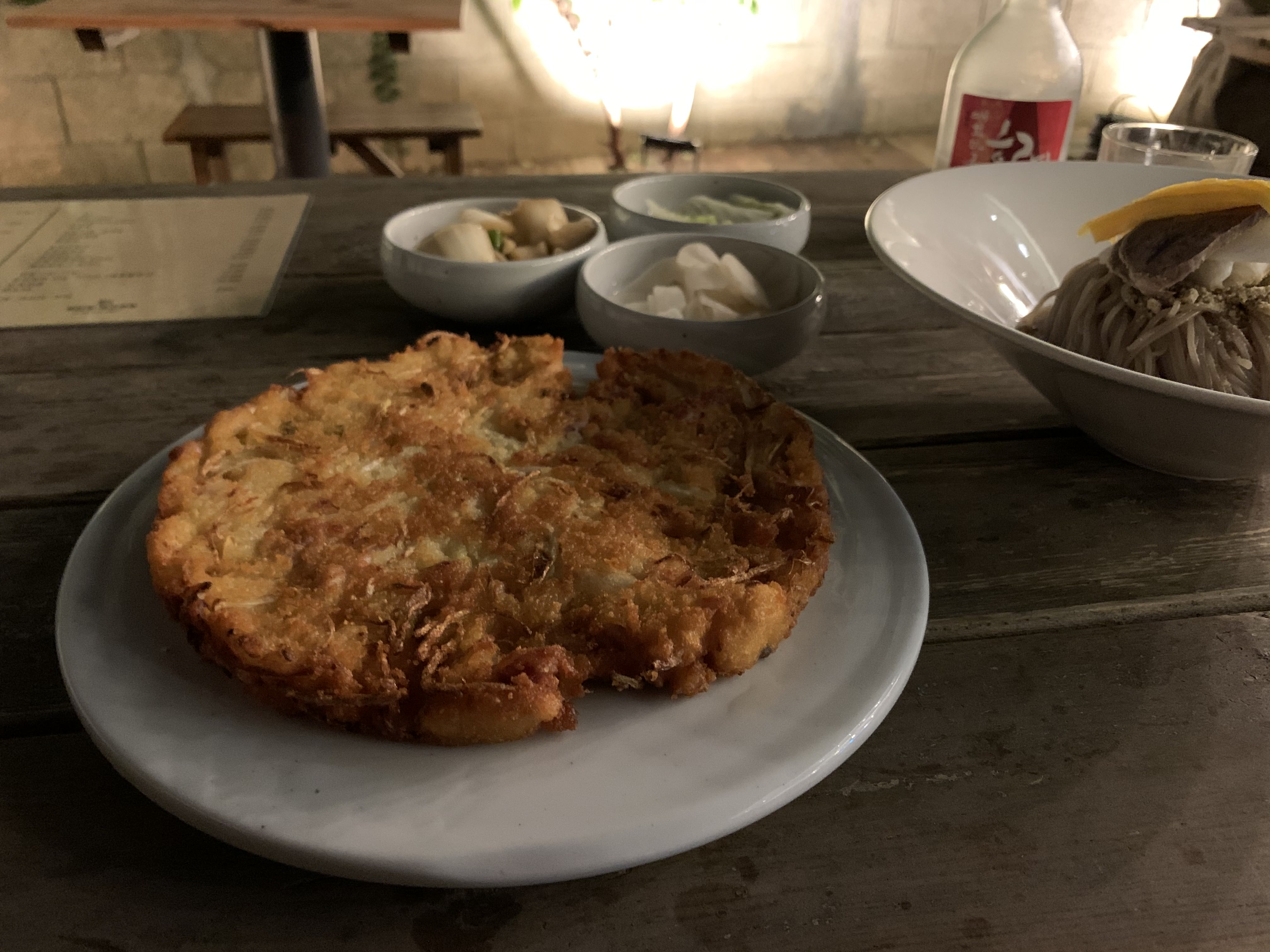 그리고 두께가 장난이 아닌 녹두전! 가격만 보고 사이드 메뉴처럼 나올 줄 알았던 우리 커플을 당황케 한 양과 퀄리티였다. 광장시장 빈대떡 퀄리티로 나오는데 기름은 그보다 적어 정말 맛있게 먹었다. 막걸리와 환상의 조합. 안에 꽤 두툼한 돼지고기 슬라이스도 많이 들어있어, 풀떼기만 먹는 느낌(?)을 상쇄해준다!