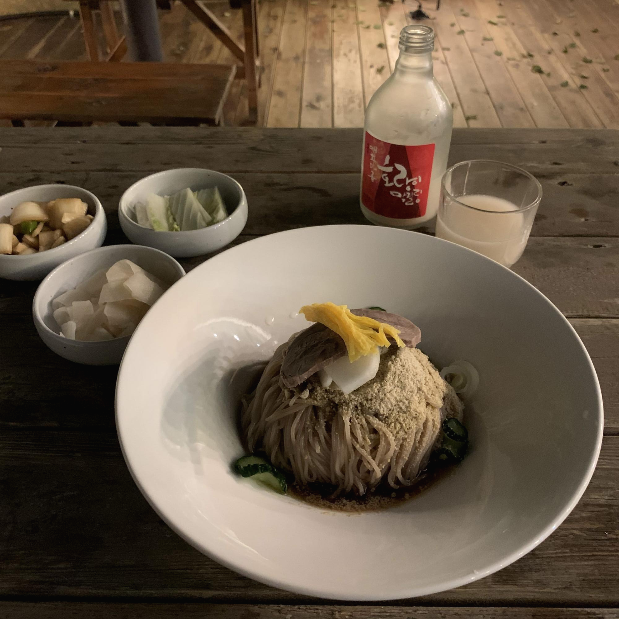 뒤이어 나온 정갈한 당인냉면. 평양냉면을 좋아한다면 꼭 먹어봐야 하는 메뉴이다. 슴슴한 국물의 맛이 가을밤 같다. 들기름 메밀면과의 조합이 아주 끝내준다. 냉면 한입, 들기름 메밀면 한입 번갈아 먹게 되는 마성의 조합.