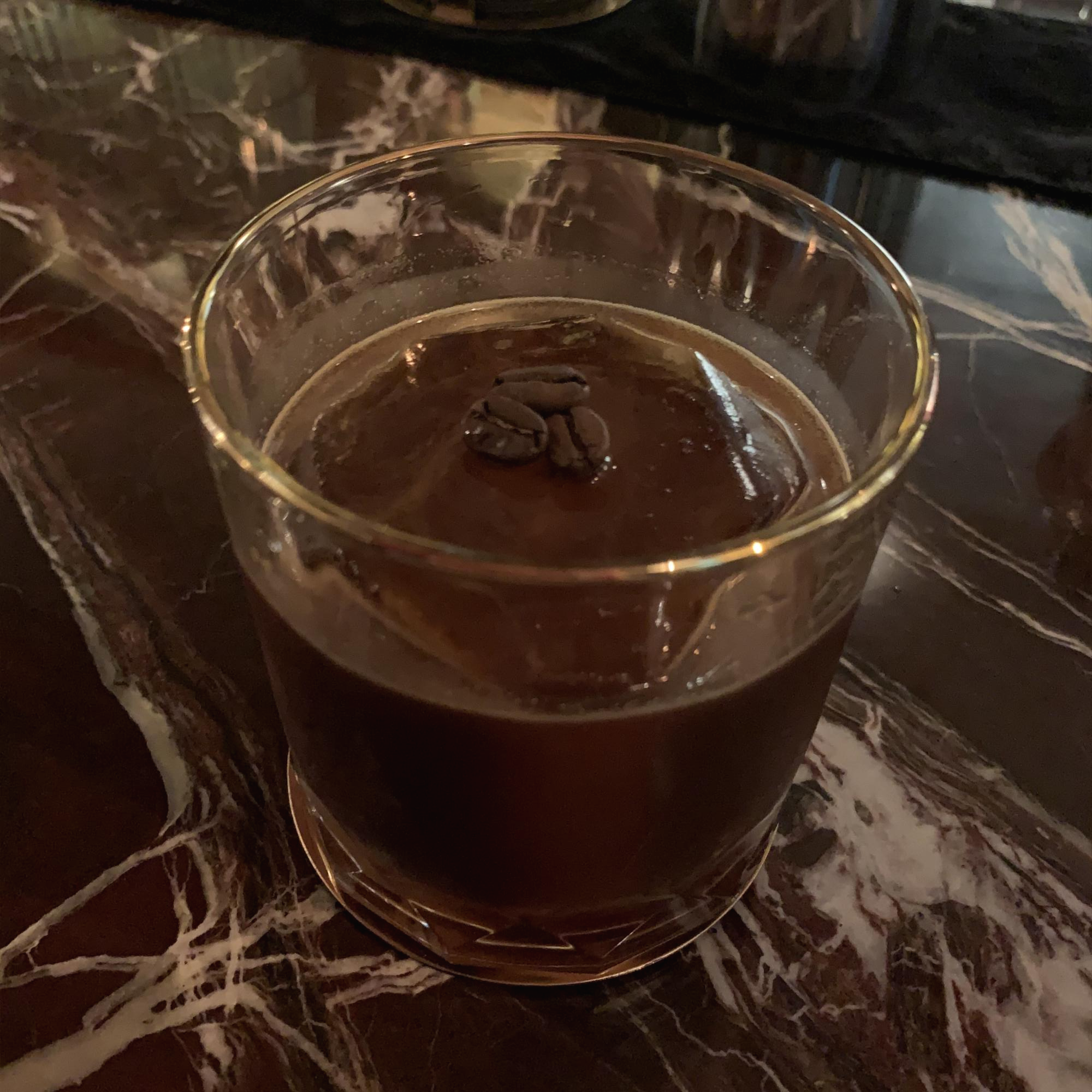 커다란 얼음을 감싼 짙은 커피향 칵테일, 아마레또 블랙. 살구씨 오일이 들어가 너티한 맛의 리큐어 아마레또가 주재료이다.
