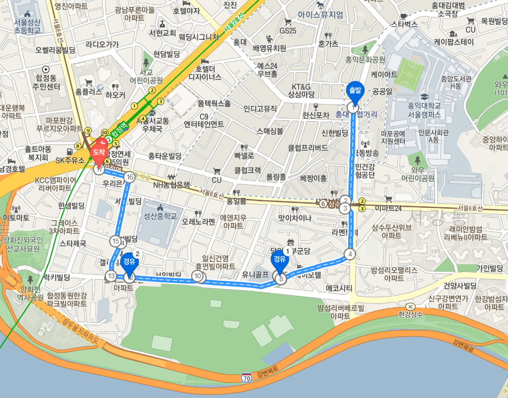 하이네스에서 나와 오른쪽으로 조금만 걸으면 문라이즈라는 카페가 나오는데, 거기서 우회전을 해서 쭉 올라가면 합정역이 나온다. 7번과 5번 출구 사이 쪽으로 빠질 수 있다. 만약 좀 더 걷고 싶다면, 한강 공원까지 나갔다가 오는 방법도 있다.