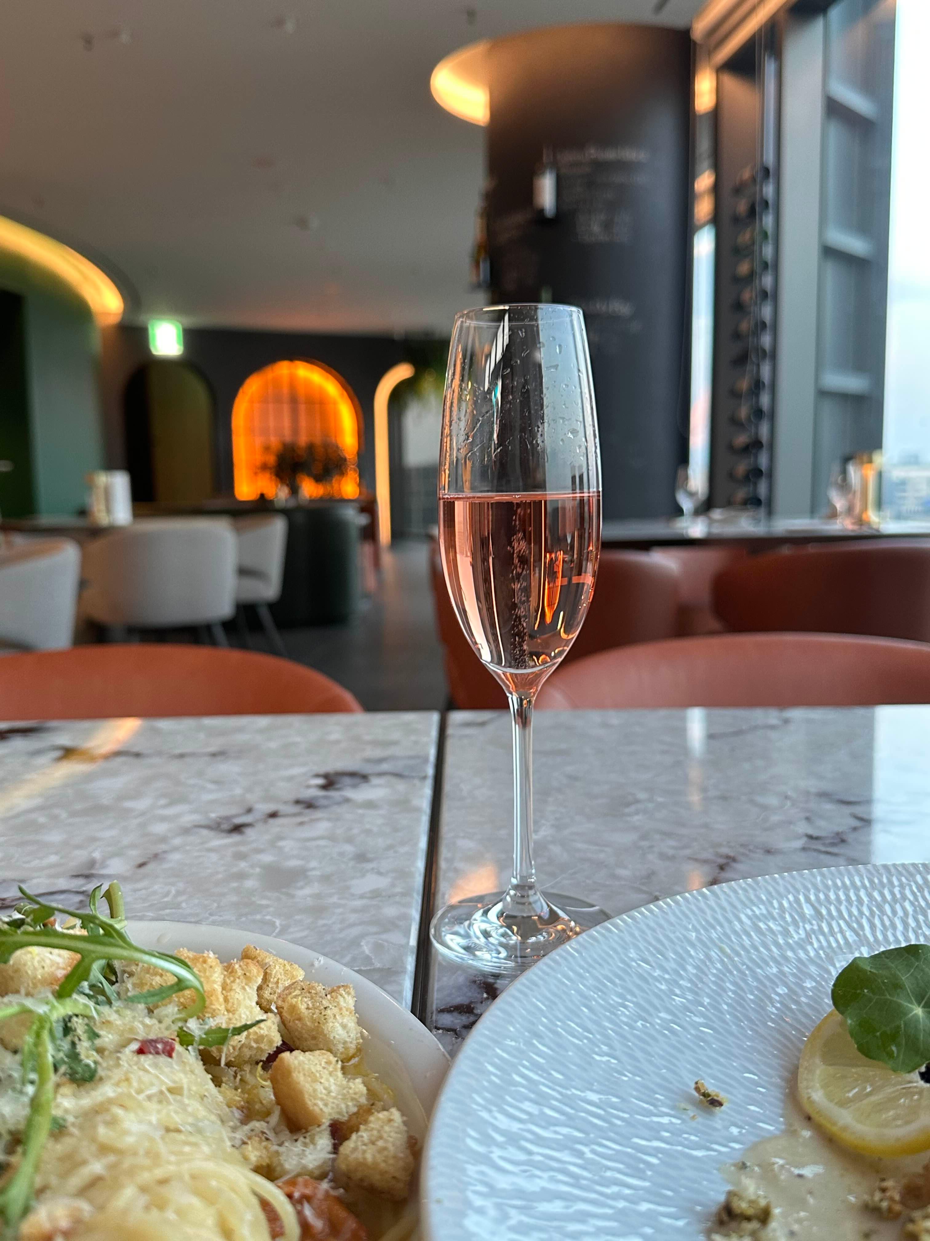 1인 7만 원대 와인 플레이트 구성으로, 로저구라트 까바 로제와 우니파스타, 생선스테이크 등의 정제된 식사 구성이 여름철 특별한 저녁 데이트를 만들어준다.