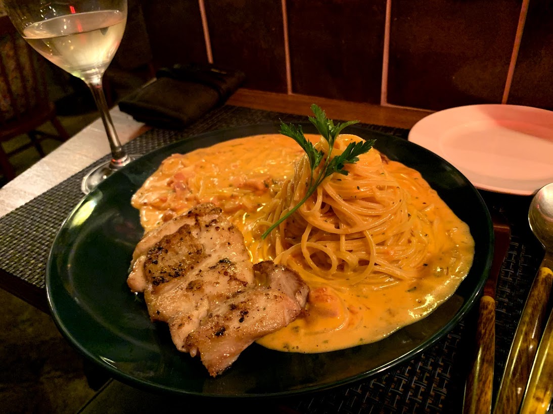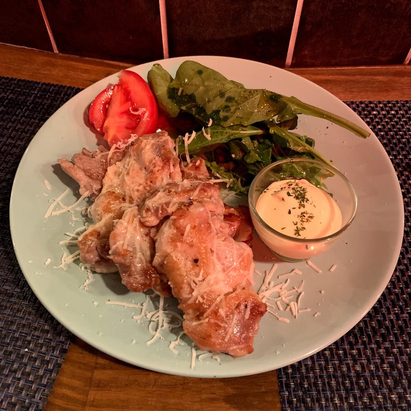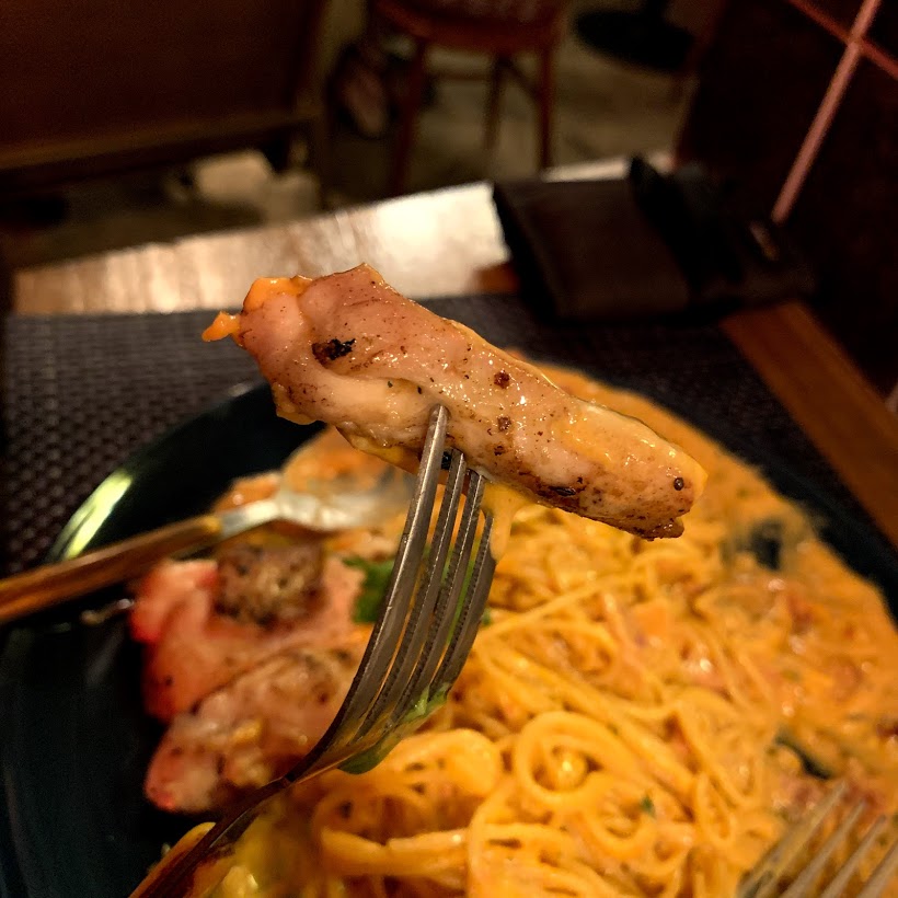 남자 친구가 주문한 로제 파스타와 닭다리살 구이도 곧이어 나왔는데, 우리를 정말 깜짝 놀라게 한 점이 있다. 바로 닭다리살의 모습이었는데, 우리가 익히 알고 있는 그 닭다리 봉이나 넓적다리 형태가 아니었던 것이다.
