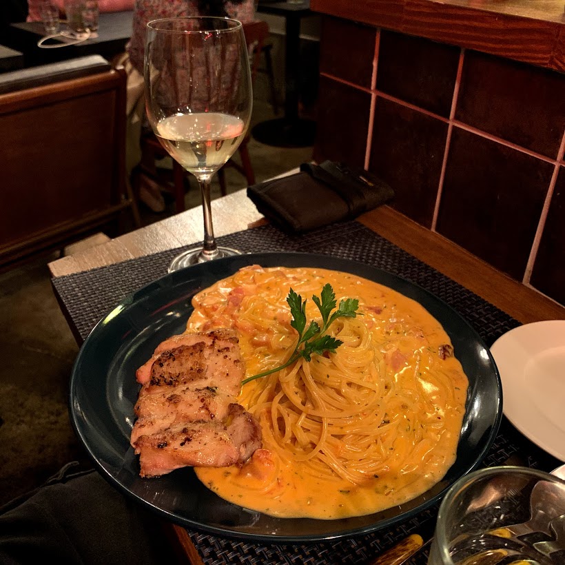 캐주얼 다이닝을 표방하는 만큼, 메뉴는 복잡하지 않다. 메인 파스타 메뉴와 와인, 그리고 적당한 안주거리와 맥주가 준비되어 있었다. 가짓수가 적지만 우리 커플의 취향을 저격하는 메뉴가 너무 많아 고민을 거듭하다 결국 바질 파스타 & 대구 튀김과 로제 파스타 & 닭다리살 구이를 주문했다. 나는 해산물 마니아, 남자 친구는 닭고기 마니아이기에 너무나 자연스러운 선택이었다. (ㅎㅎ)