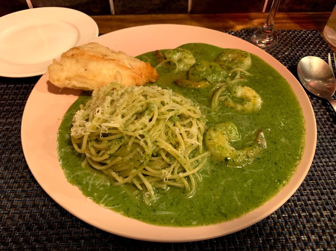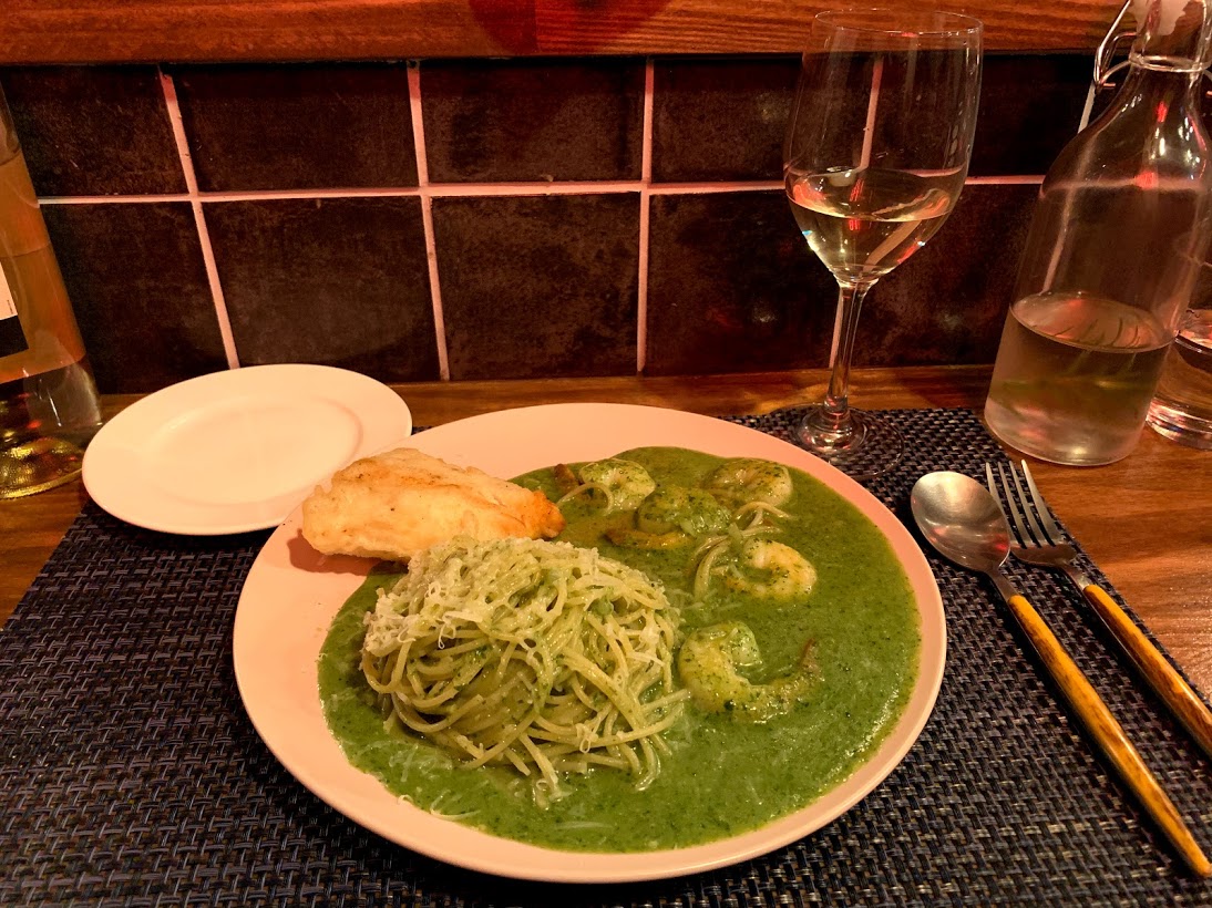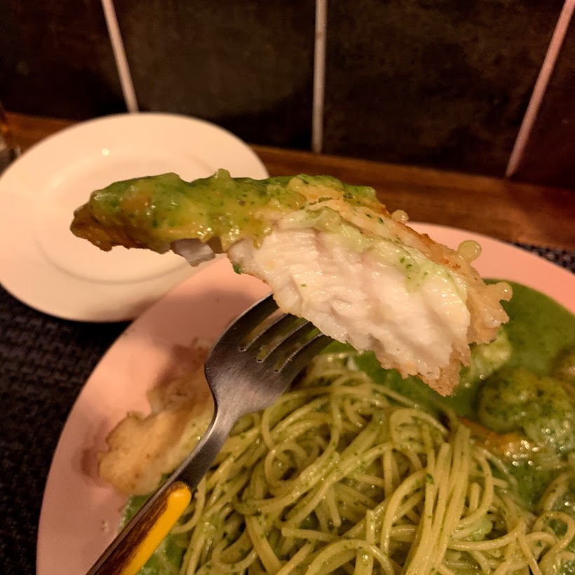 드디어!! 기다리고 기다린 바질 파스타가 나왔다!! 굵직한 새우와 토실한 대구살의 자태를 보니 흥분이 가라앉지를 않았다. 연녹색의 바질 소스는 맛보기 전부터도 이미 코로 한 접시를 다 해치울 수 있을 것 같은 향을 풍겼다.