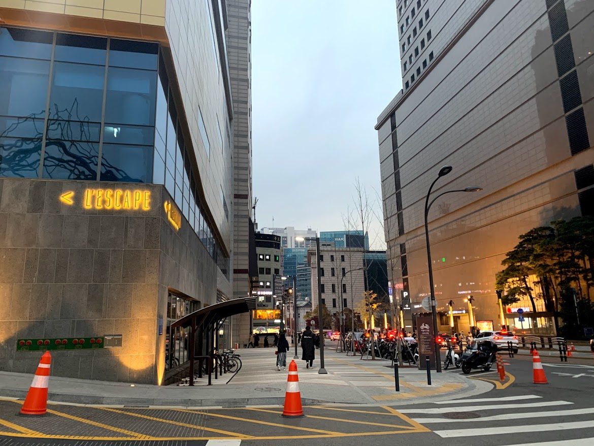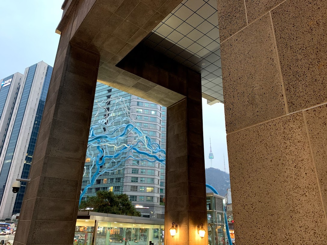 회현역 7번 출구로 나오면 바로 신세계 백화점 건물이 대각선으로 보이는데, 그 왼편 가파른 언덕배기로 어서 오르라는 레스케이프 호텔의 표지판이 보인다. 뒤편으로는 어렴풋이 남산타워가 보인다.