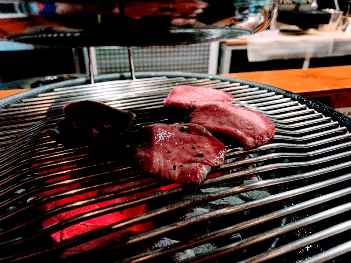 다음은 소꼬리. 단면을 얇게 자른 모습인데 국밥에서 본 것 말고는 이렇게 구워 먹는 걸 처음 봐서 신기했다. 양념이 되어 있는데 나에게는 너무 짜게 느껴져서 한 입만 먹고 남자 친구에게 양보했다. 바짝 익히면 쪼그라드는 모습이 인상적. 원래 구워 먹는 부위가 아니어서 그런지 약간은 다루기 힘든 느낌이다.