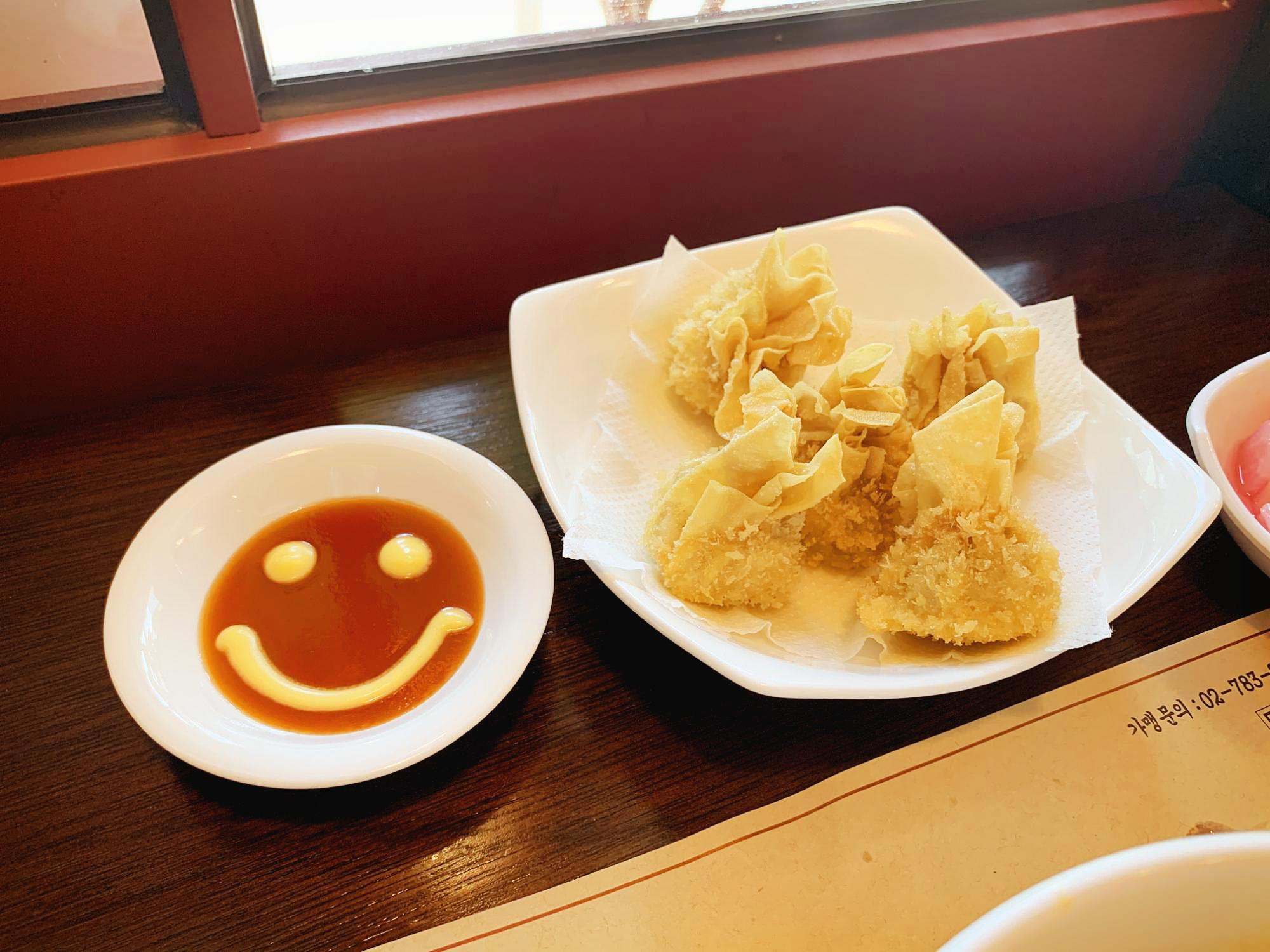 거 집사 양반, 혼자 와서 잘도 먹네. 소스가 스마일을 날려 준다. 새우완탕튀김의 플레이팅 모습은 미약하지만 입 안에 들어가면 사정이 달라진다.