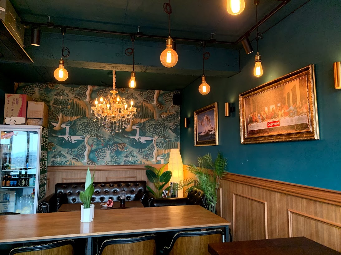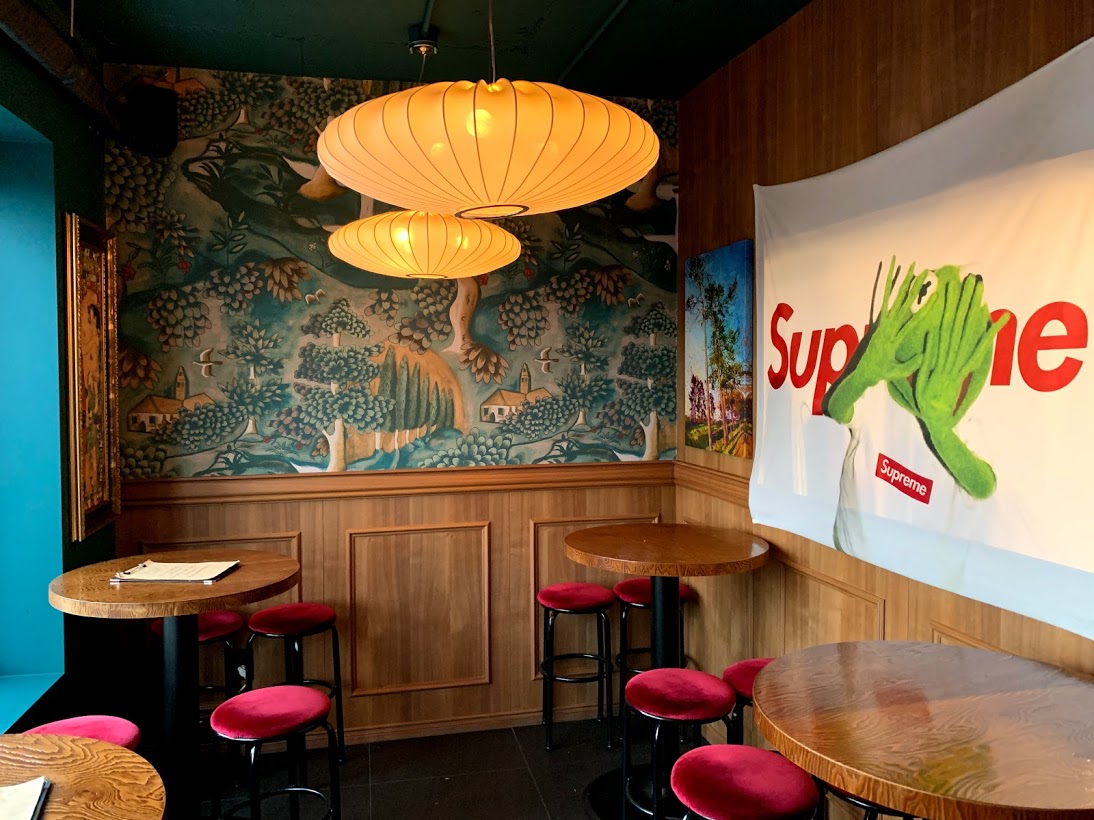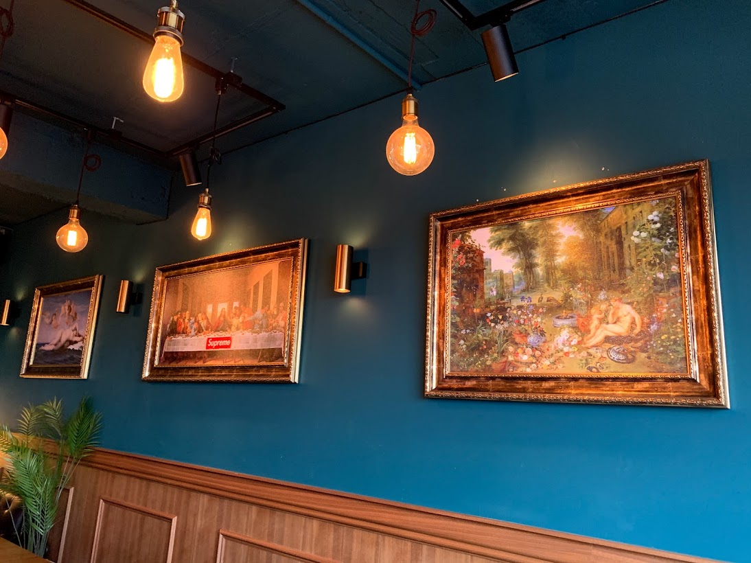 이태원 맥주집은, 내가 좋아하는 스트릿 패션 브랜드 수프림이 감각적으로 재해석한 명화와 센스 있는 현수막들로 자칫 너무 무거워 보일 수 있는 차분한 인테리어에 산뜻하게 틈을 주었다. 샹들리에와 등, 동양화와 서양화를 믹스 매치한 포인트들이 인상 깊다.