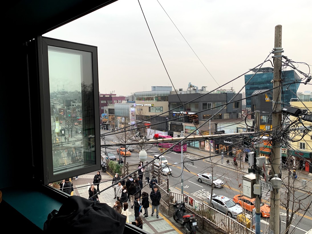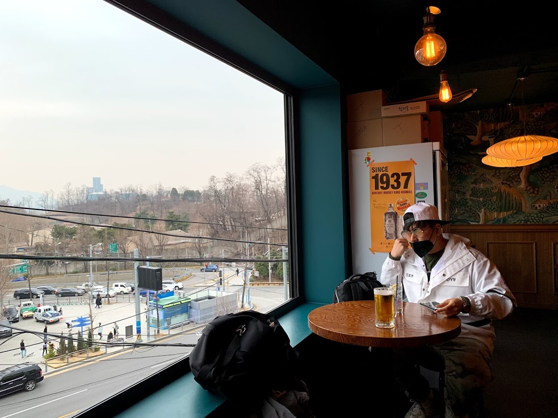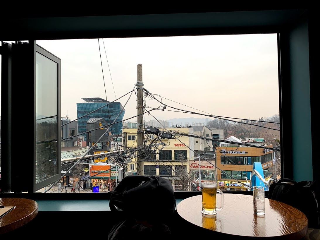 그러다가 단밤 바로 옆, GS25가 1층에 자리한 건물 2층에 '이태원 맥주집'이라는 초록 네온 간판이 선연히 보여 지체 없이 걸음을 옮겼다. 한참을 걸은 후라 진짜진짜 목이 마른 상태였기 때문. 익스테리어에서 예상했던, 탁 트인 창문은 안쪽에서 봐도 근사했다. 바로 생맥 한 잔을 시켜두고, 사진을 더 찍기 시작했다.