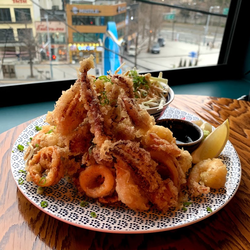와, 전용 소스에 레몬과 와사비, 고슬고슬한 쪽파까지 완벽한 일식 튀김이었다. 튀김옷이 거칠지가 않다. 그냥 노가리 포차 같은 곳에서 나오는 분식 같은 오징어 튀김이어도 이런 뷰를 가진 곳이면 만족하고 먹을 수 있을 것 같은데, 최근 먹어 본 튀김 중 단연 최고였다. 새우도 탱글탱글하고 알이 굵은 진짜 새우다운 새우였다.