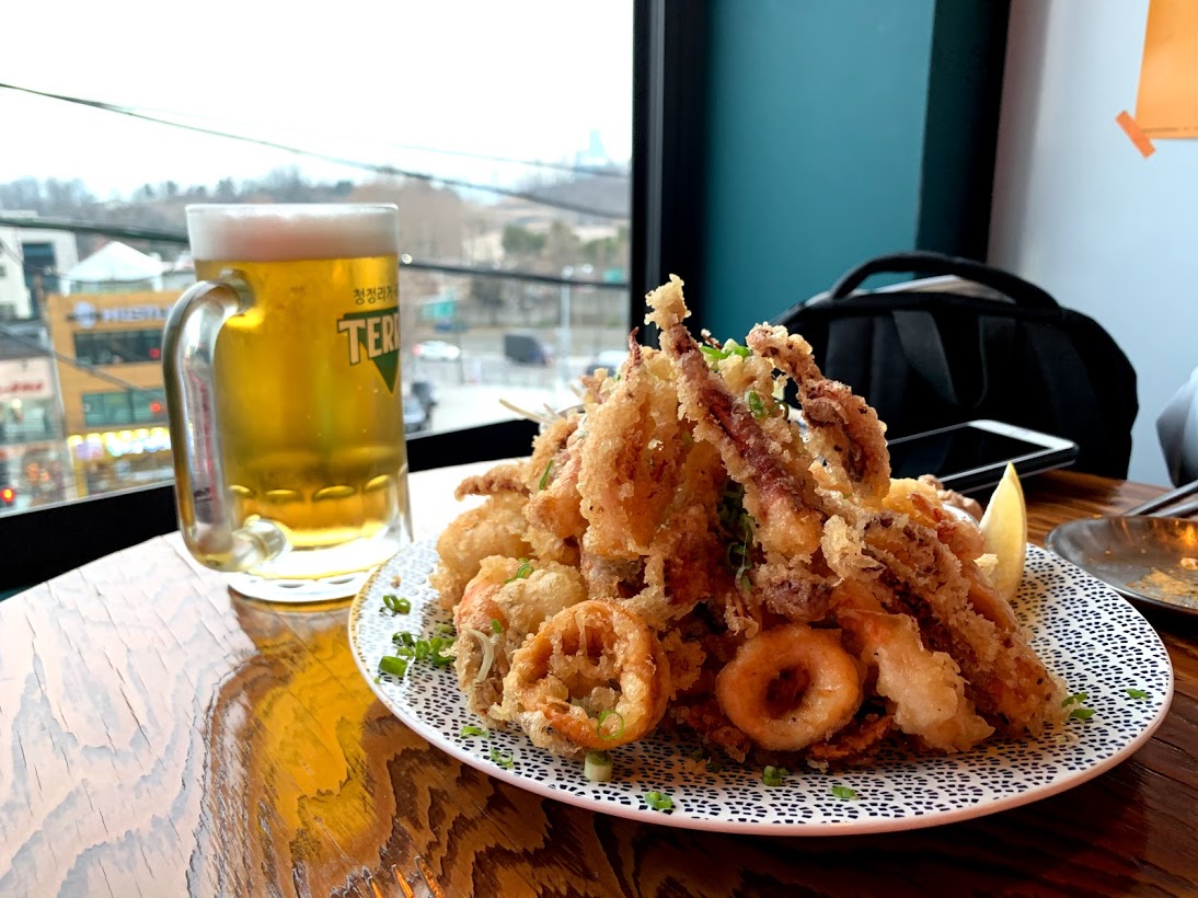 탄산 충만한 테라 생맥주(5,000원)에 시원한 바깥바람을 쐬며 창밖을 감상하고 있자니 무릉도원이 따로 없다. 테라의 고소한 맛은 역시 생맥주로 즐겨야 한다. 테라 외에는 레드락 생맥주가 구비되어 있고 다른 맥주는 병맥이다. 하이볼이나 와인 등 가짓수는 적어도 주종이 여러 개라 고르는 맛이 있는 이태원 맥주집. 오래 기다리지 않아 첫 번째 안주가 나왔다.