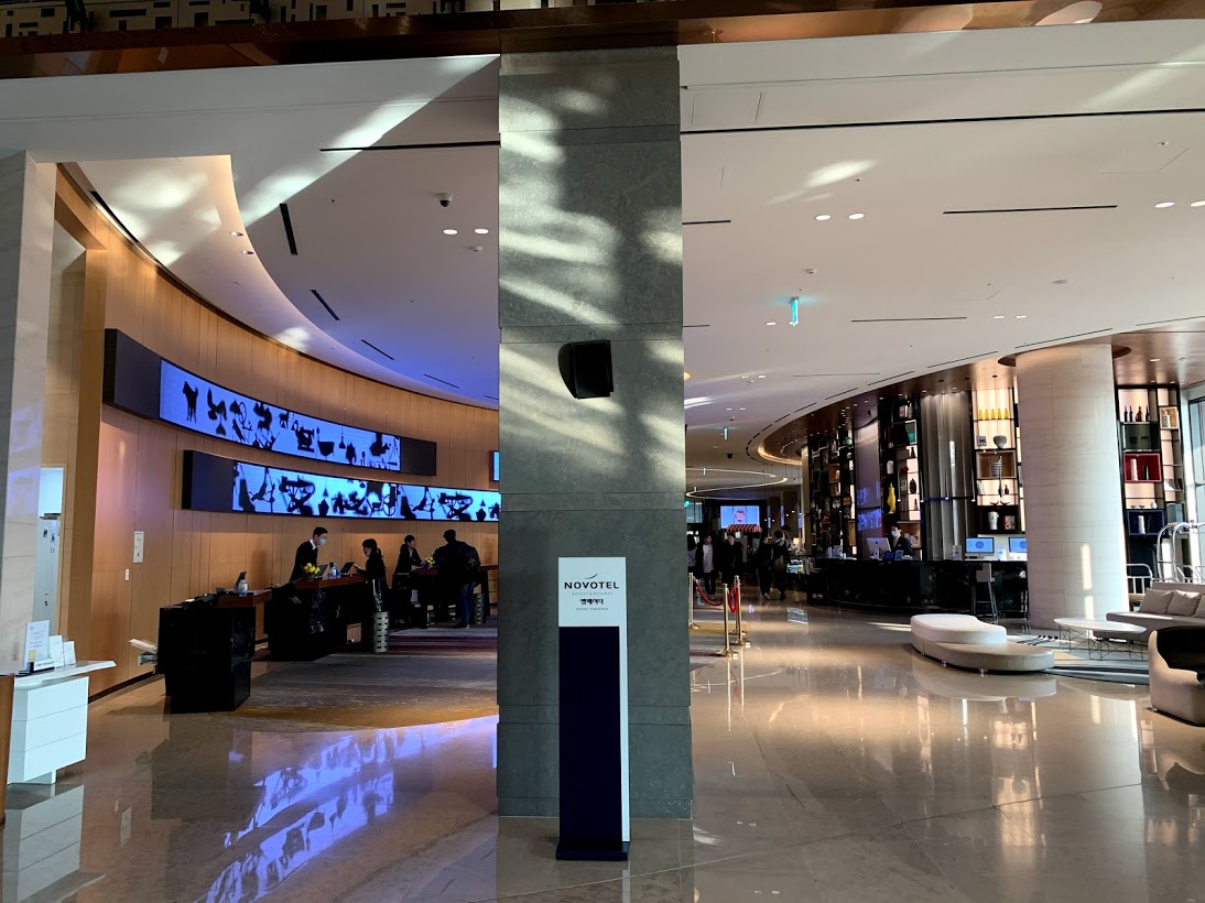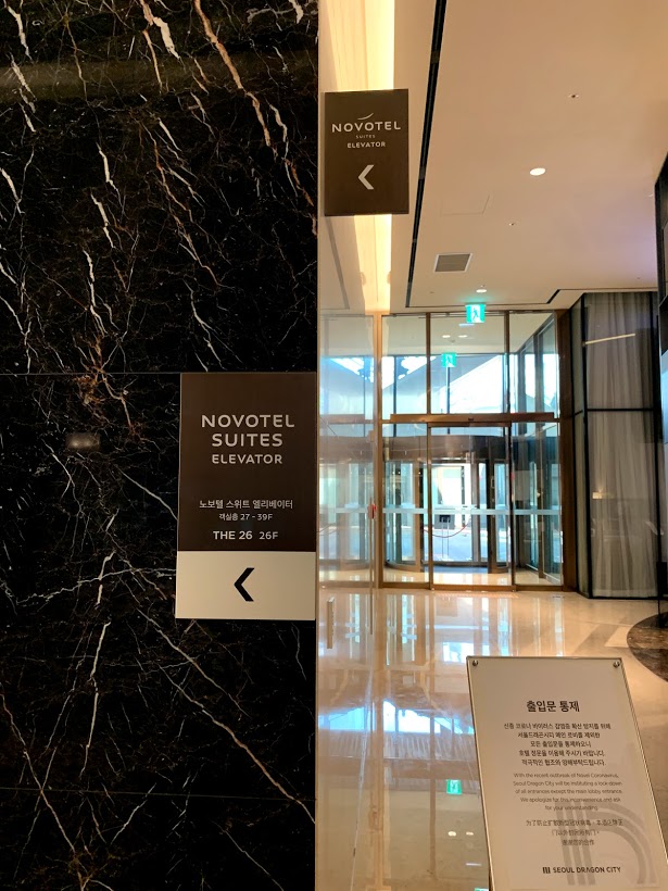 열감지 검사 구간을 통과하고 왼쪽으로, 노보텔 앰배서더 서울 용산 체크인 로비로 향한다. 스위트룸 체크인 데스크는 26층에 별도로 마련되어 있기 때문에 이곳에서 체크인을 할 필요는 없고, 우선은 스위트룸 전용 엘리베이터를 통해 이동해야 한다.