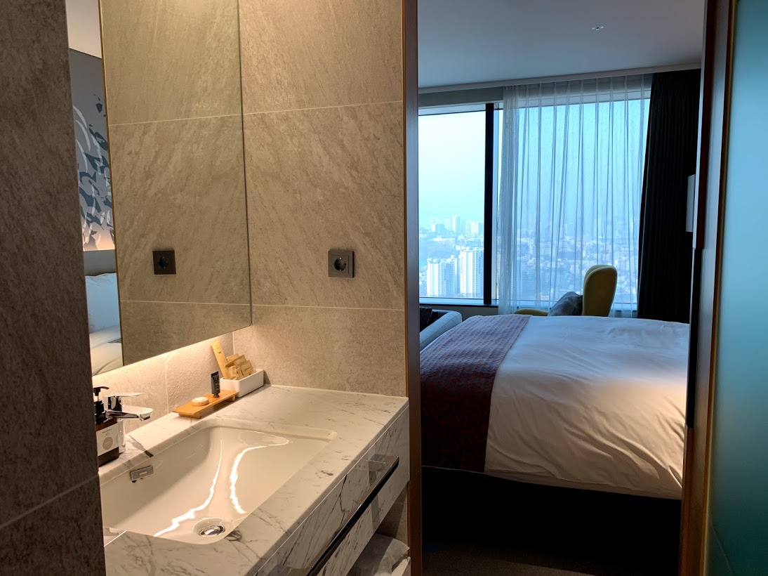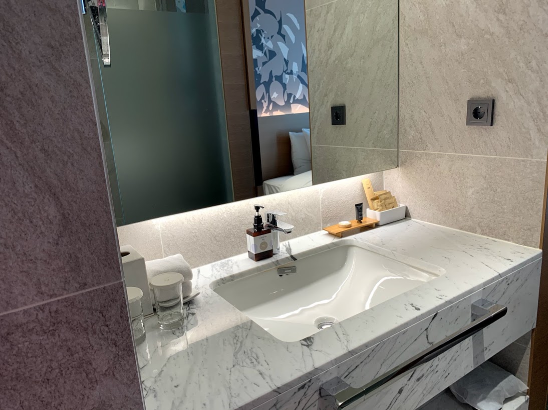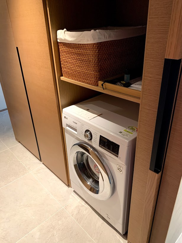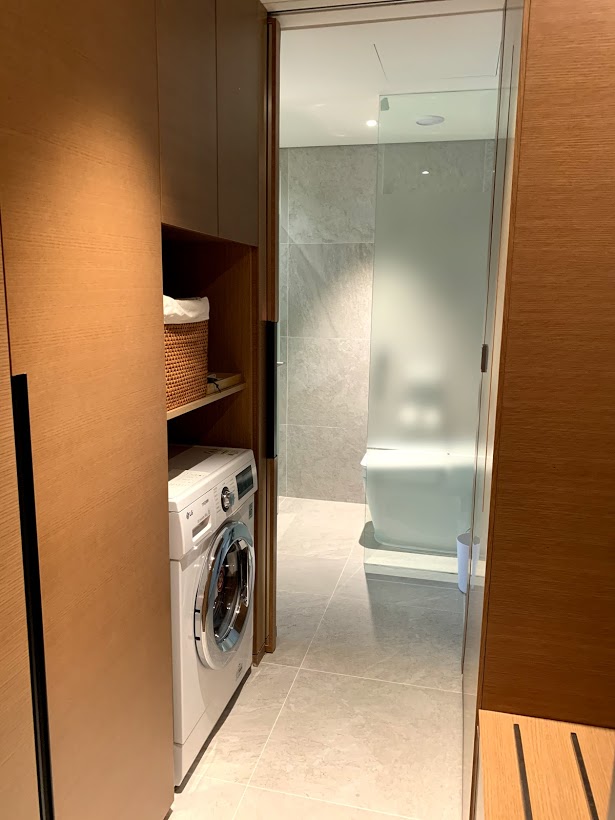 노보텔 앰배서더 서울 용산 주니어 스위트룸은 세탁기와 세면대, 욕실의 동선이 편리하게 되어 있고 미닫이 문으로 구획을 나눌 수 있다. 다만 온수가 잘 나오지 않아 미지근한 물로 샤워를 해야 했던 점이 불편했는데, 그렇다고 방을 옮기기엔 너무 귀찮아서 그냥 썼다. 세면대는 콜러. 비싼 브랜드로 인테리어에 신경 쓴 것이 보인다. (전에 논현 가구 거리에서 콜러 가격 보고 기함을 했던 기억이...)