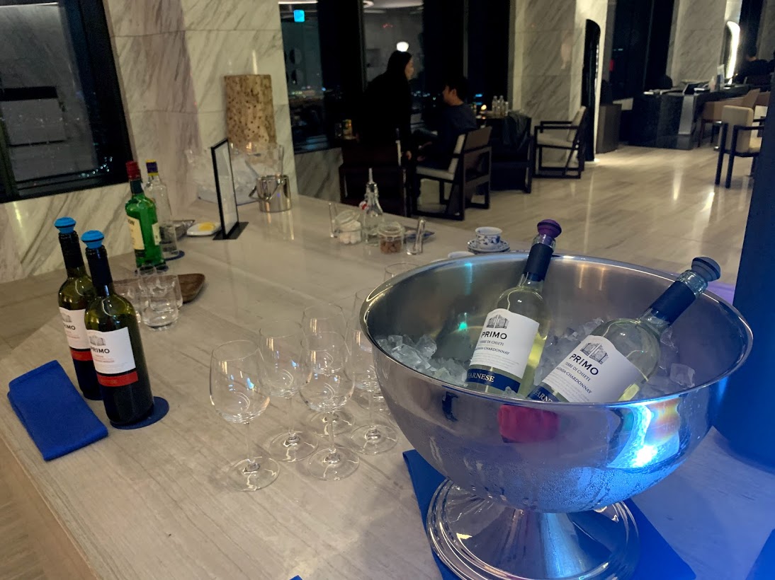 가짓수는 적지만 콜드파스타, 고기 요리, 롤, 와인 안주 등이 비치되어 있어 자유롭게 가져다 먹을 수 있었고, 진, 위스키, 와인과 기타 음료들이 구비되어 있어 칵테일을 만들어 마시기도 좋았다. 직원에게 문의하면 진저에일이나 토닉워터도 가져다준다. 하지만 서빙 인원이 한명 뿐이라 오래 기다려야 한다.
