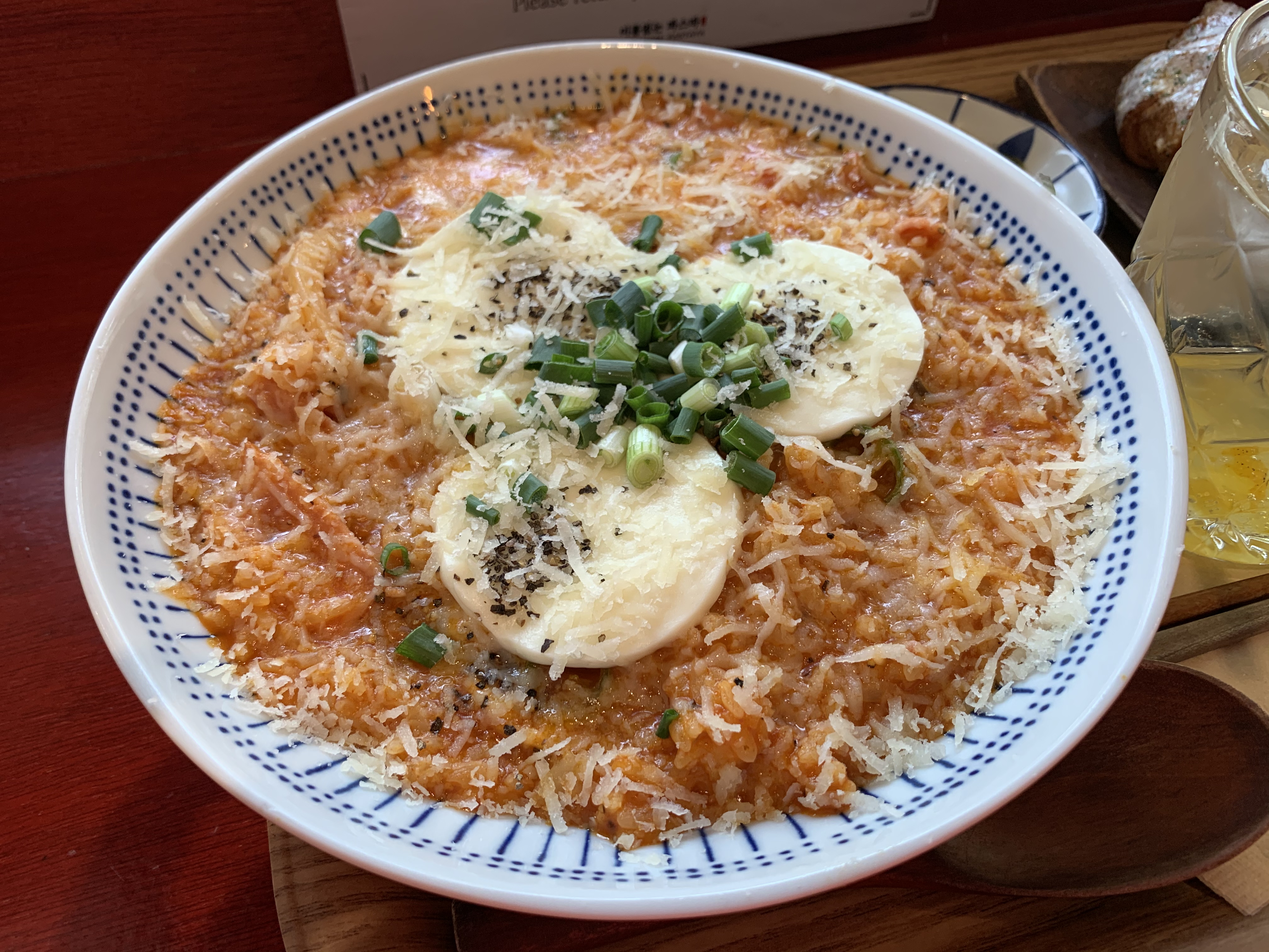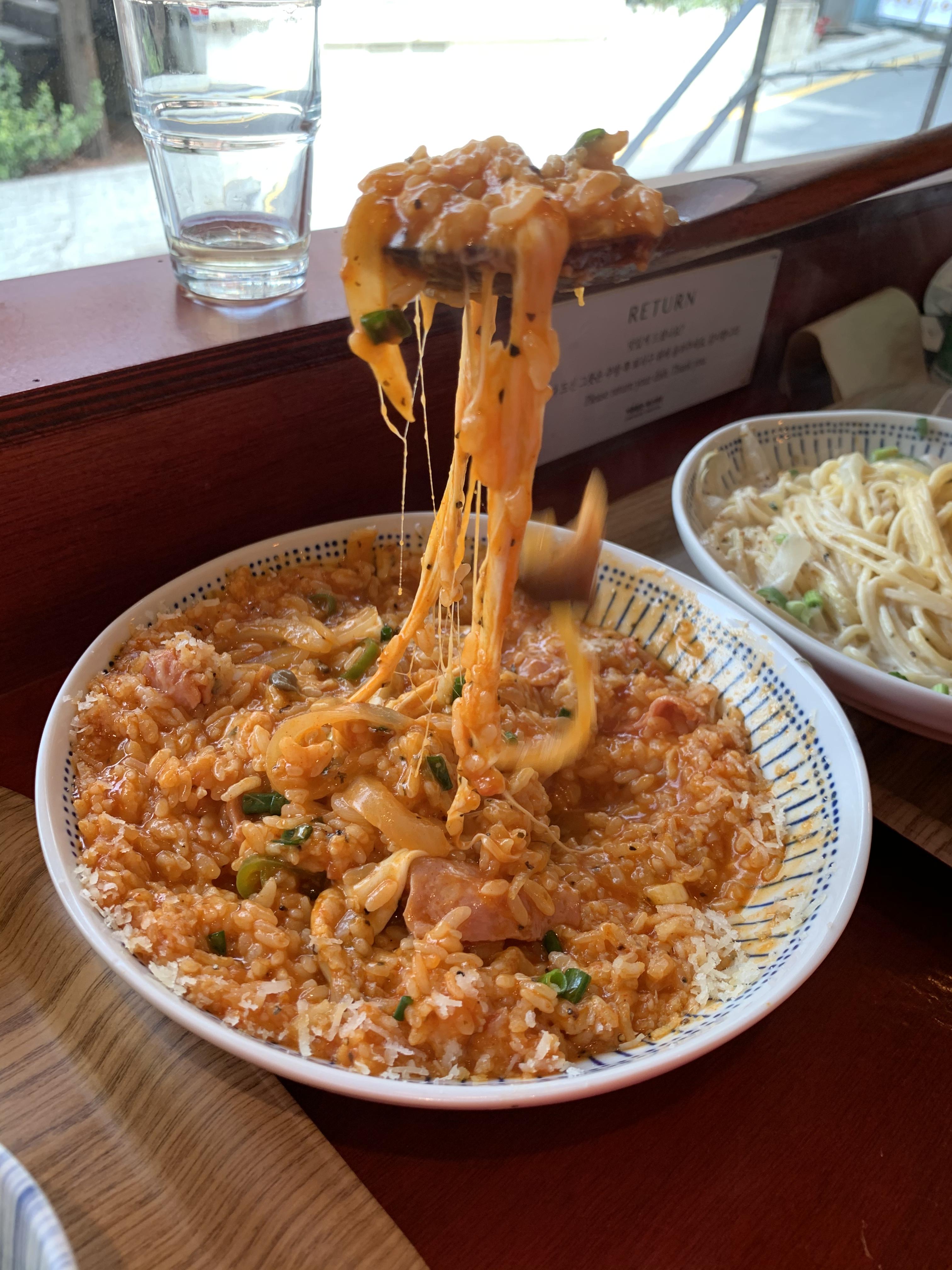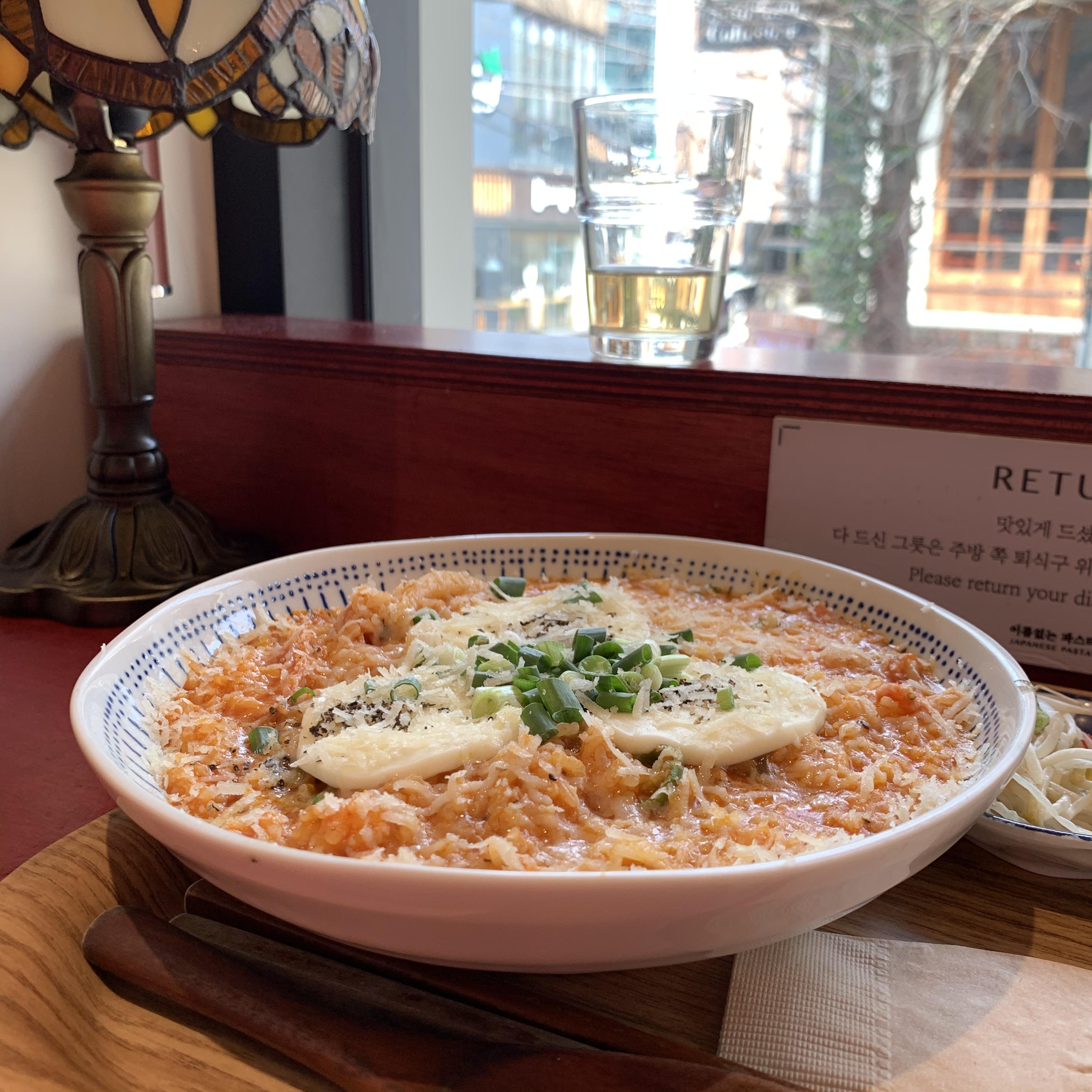 싱겁다는 평도 많이 보이는데, 내가 방문한 날은 실력 있는 아르바이트생이 주방을 보던 날인지 맛이 괜찮았다. 통후추가 많이 뿌려져 있어 알싸한 느낌도 최대치로 즐길 수 있었다. 치즈 리조또는 온도가 그리 뜨겁지 않아서 치즈가 제대로 녹지 않았다는 것 빼고는 꽤나 훌륭했다. 생 모짜렐라가 그대로 느껴지는 리조또라니.