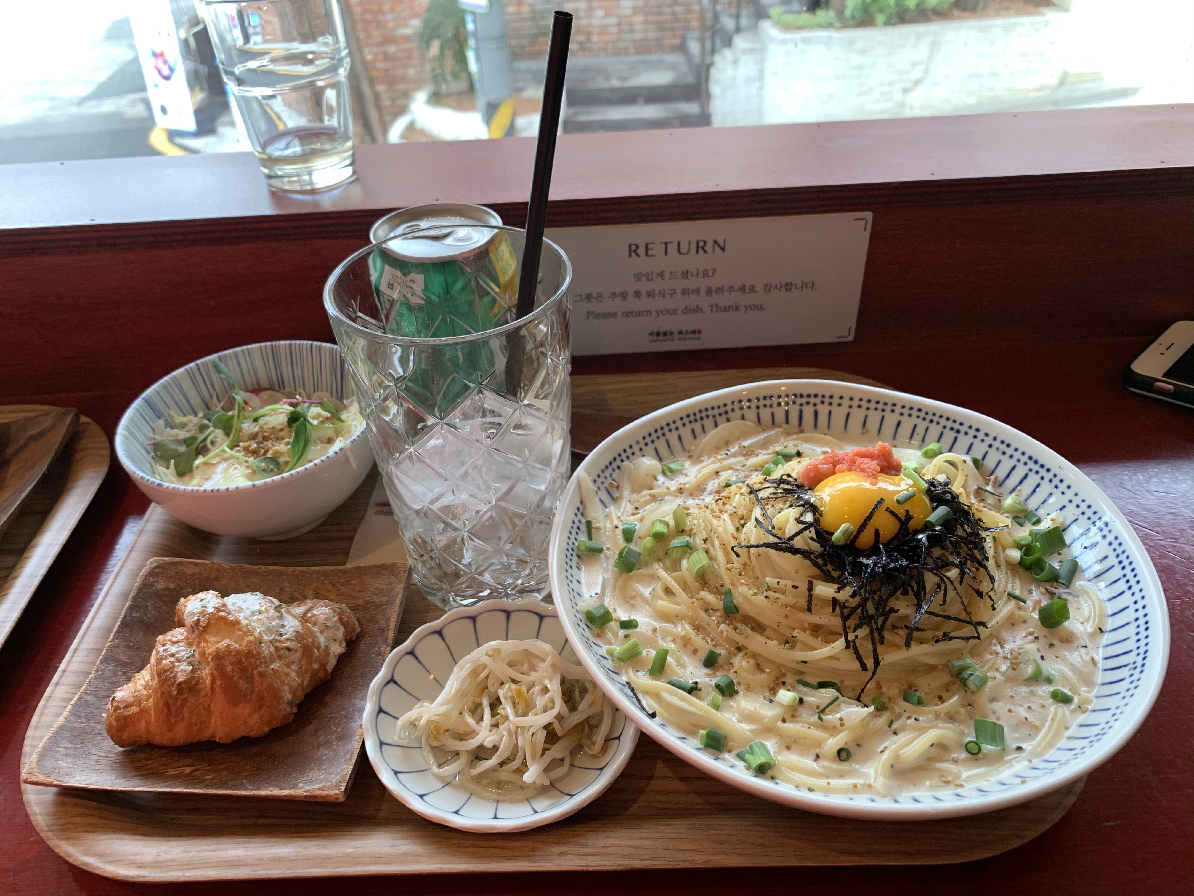 명란 까르보나라 세트와 치즈 리조또 세트를 사이즈 업하여 주문했다. 각각 12,700원, 14,000원이니 강남 일대에서 먹는 직장인 점심치고는 나쁘지 않다. 기분 전환에 1도 도움이 되지 않는 일반적인 식사에도 이 정도 돈을 써야 하니 말이다.