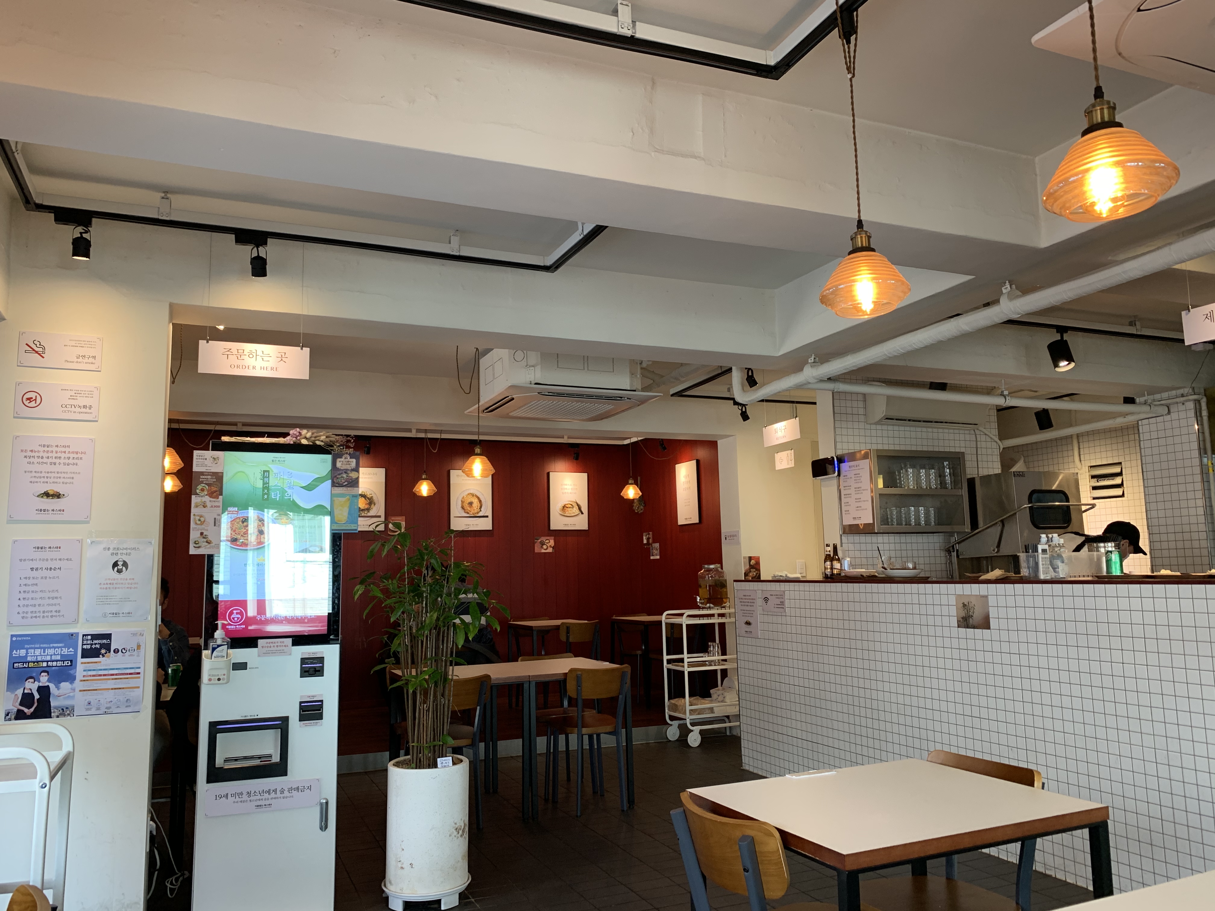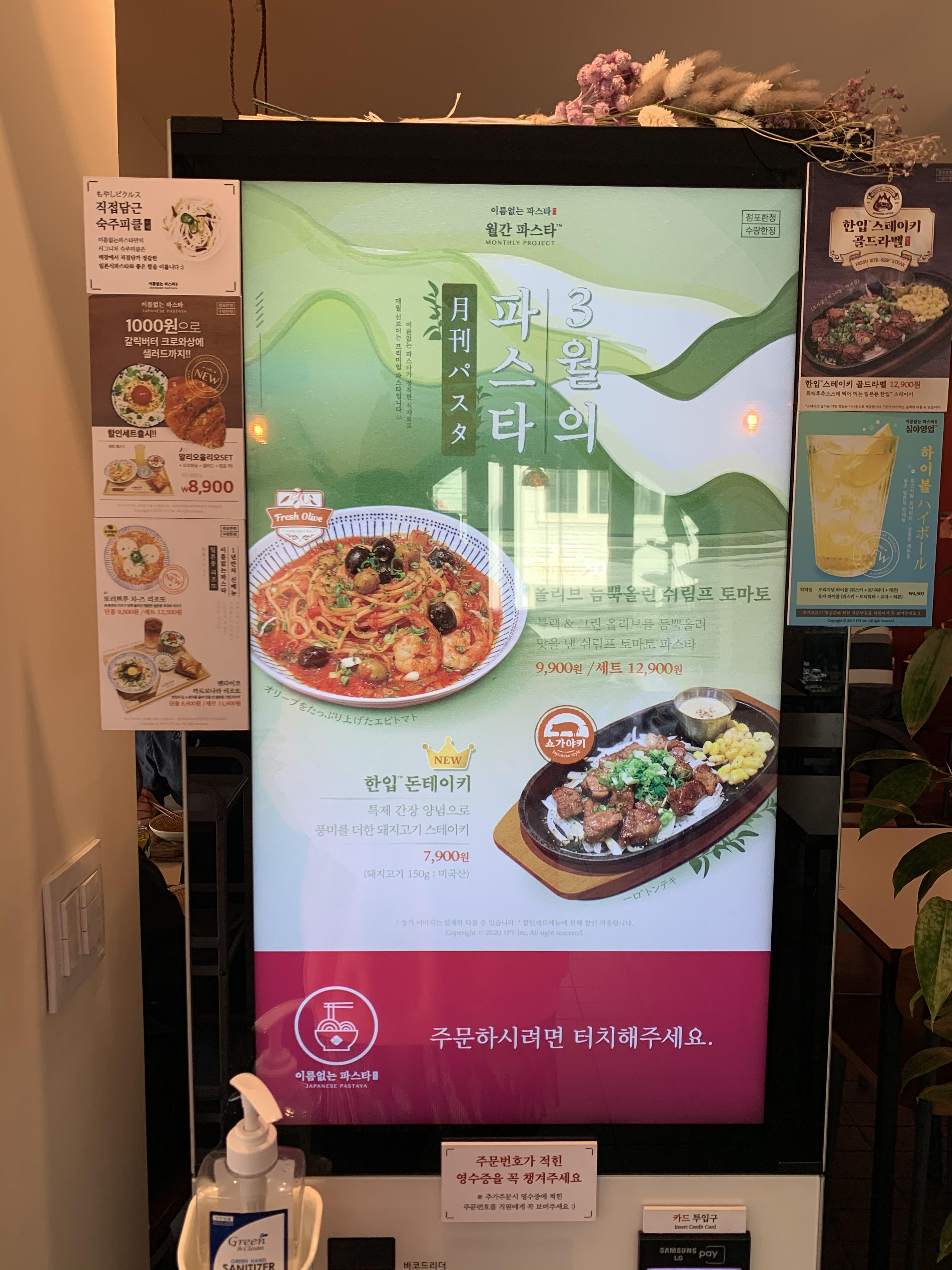 코로나 19로 이래저래 신경 쓰이는 와중에도 출근은 했으니 밥은 먹어야 하고. 그러다 보니 그나마 대면을 최대한 안 할 수 있는 키오스크 주문 매장을 가게 된다. 이름 없는 파스타는 체인점인 만큼 이런 키오스크 주문을 선제적으로 도입했던 곳이다. 코로나 사태를 예견하지는 못했겠지만 훌륭한 처사다.