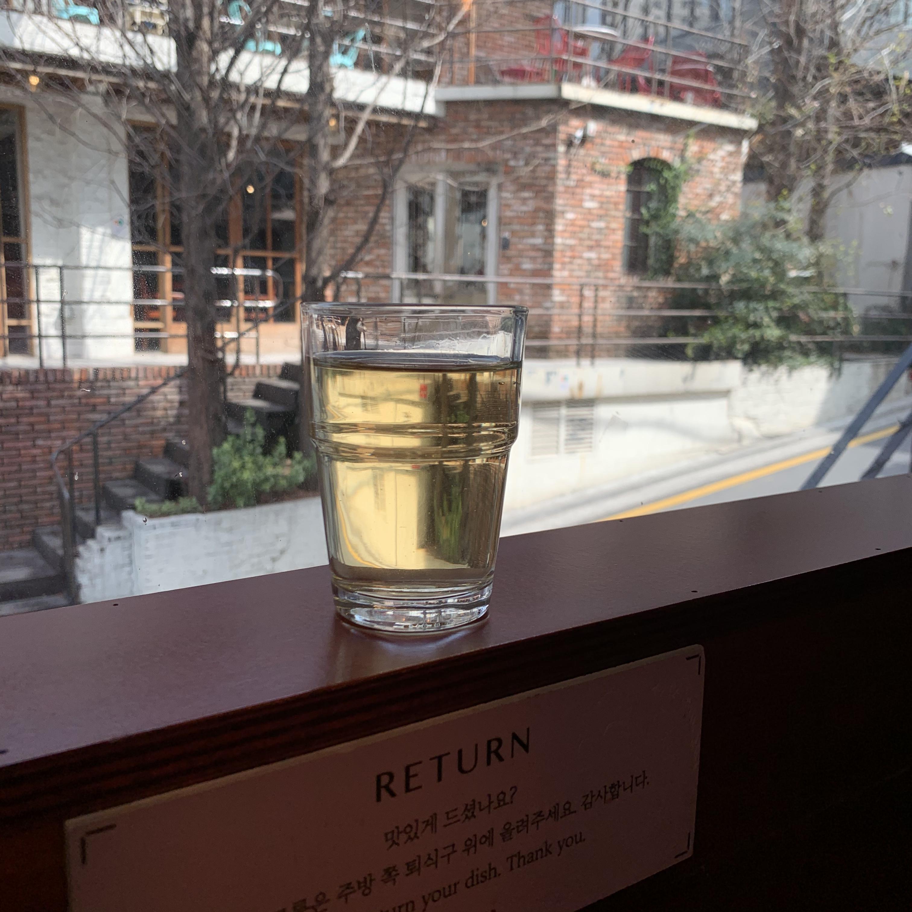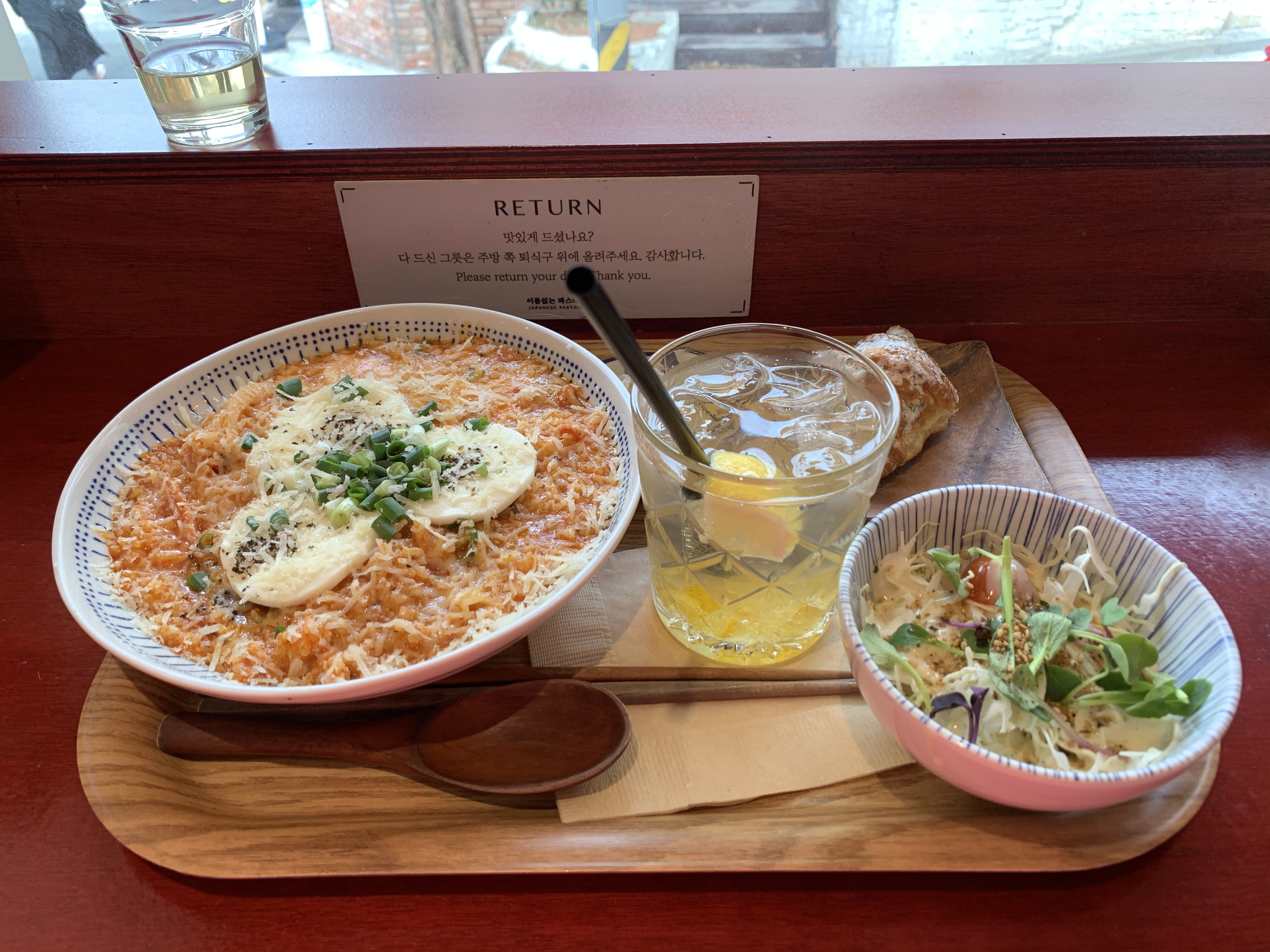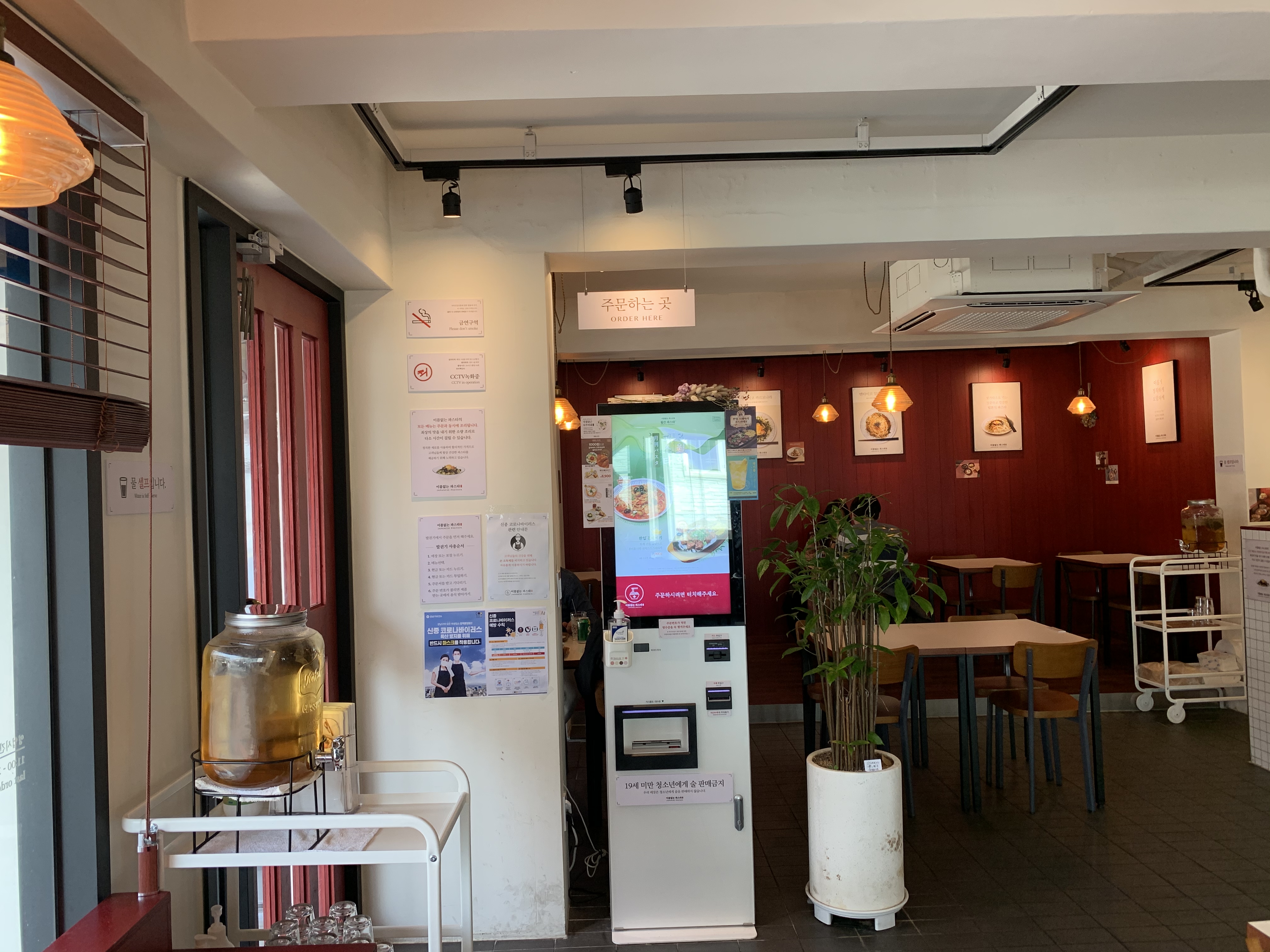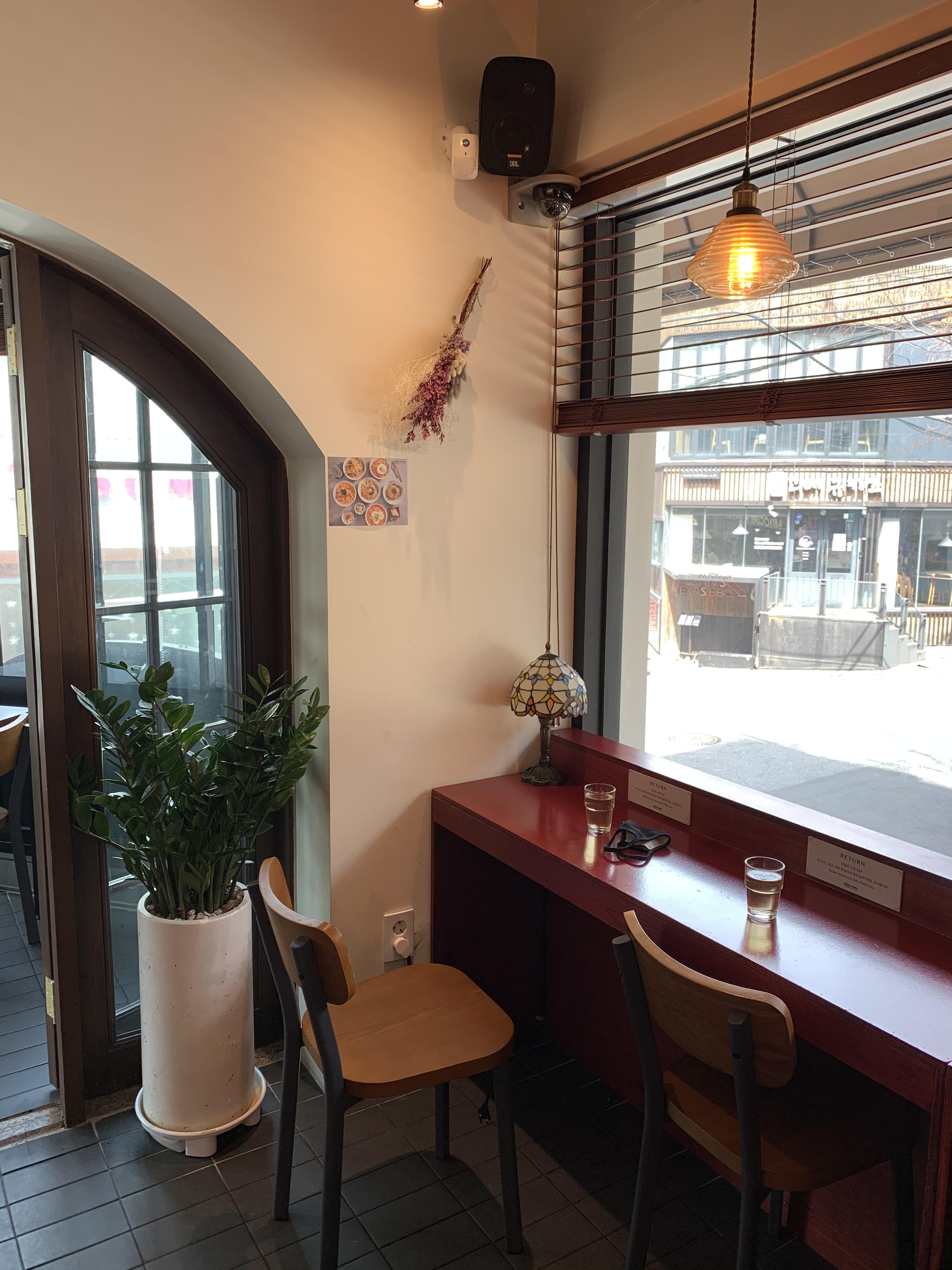 출입구에서 바로 오른쪽에 창밖을 바라볼 수 있는 붉은 바 자리가 있는데, 요즘 같이 햇볕 좋은 날에 제격이다. 키오스크에서 이미 주문을 했기 때문에 찻잎을 우린 물을 가져다 놓고 대기했다. 셀프서비스이기에 요리가 완료되면 키친 쪽으로 가지러 가면 된다.