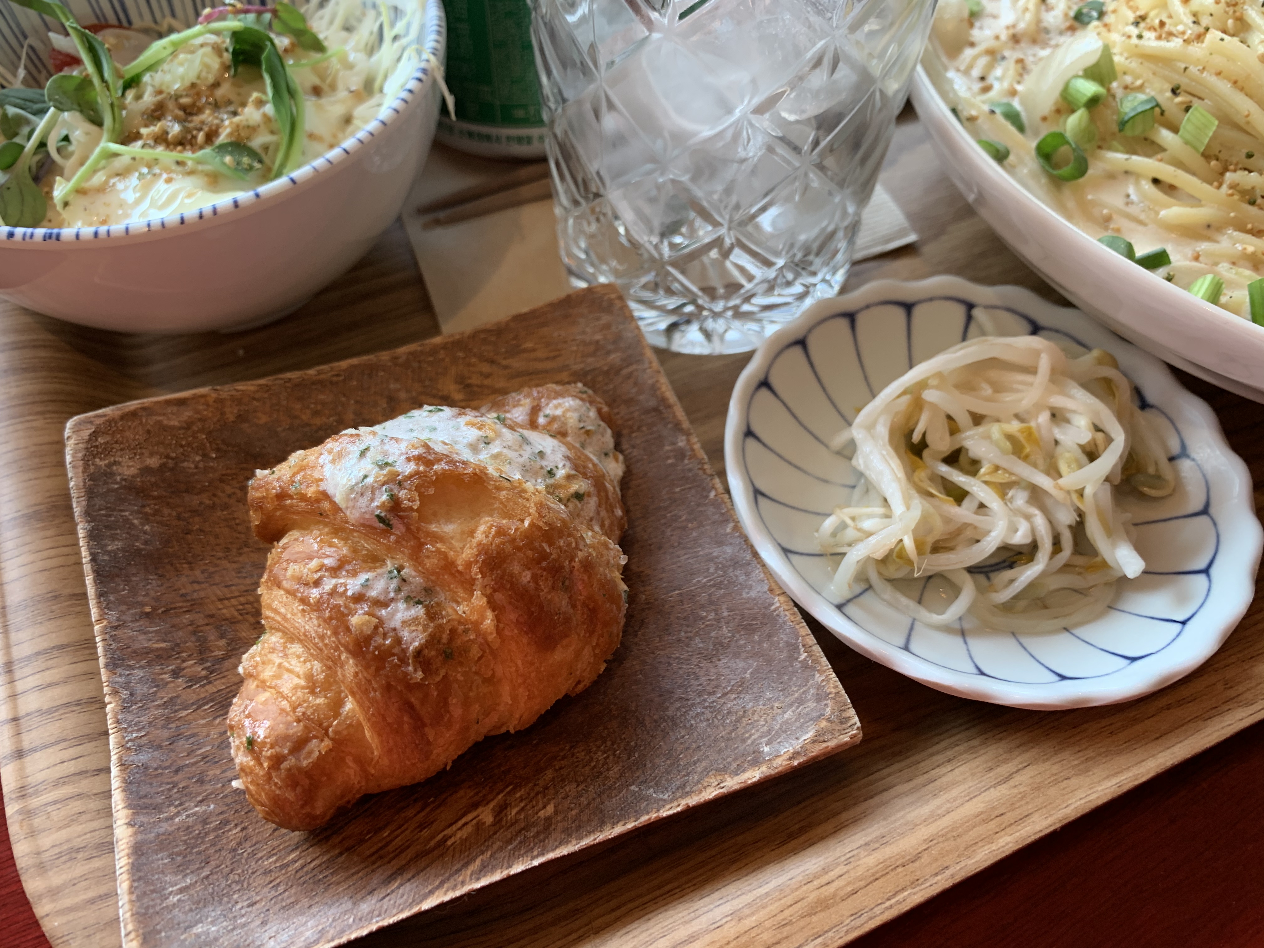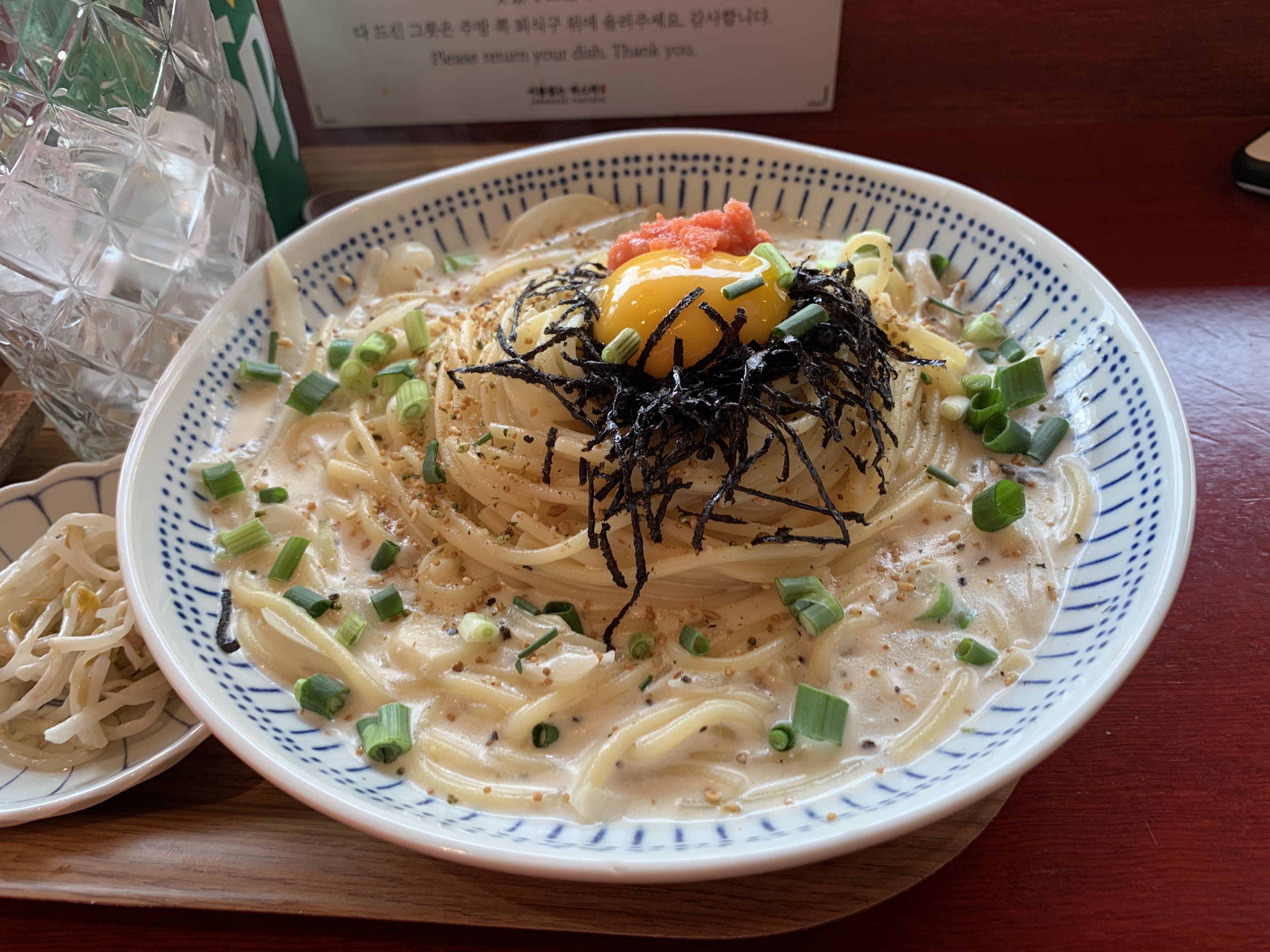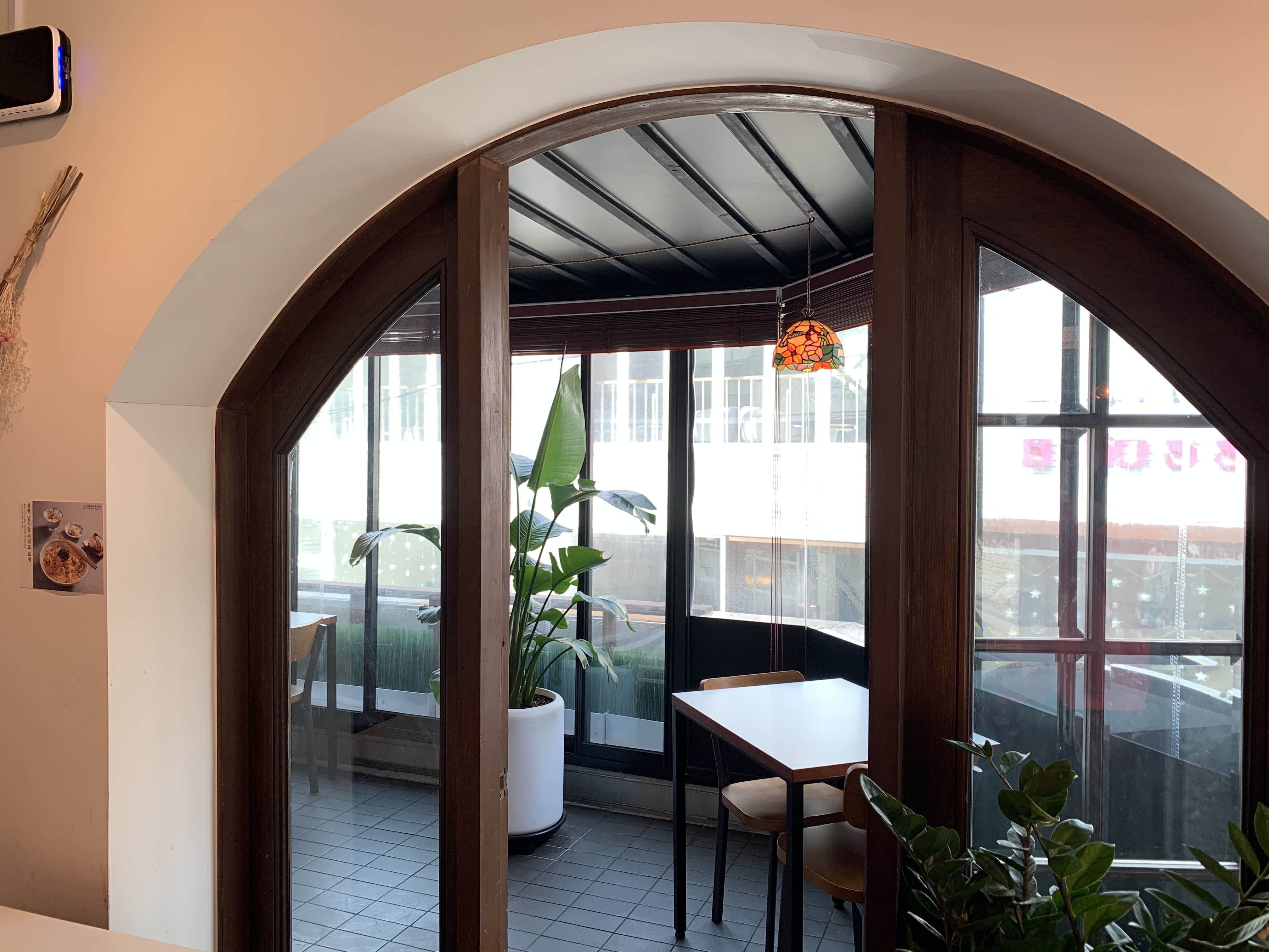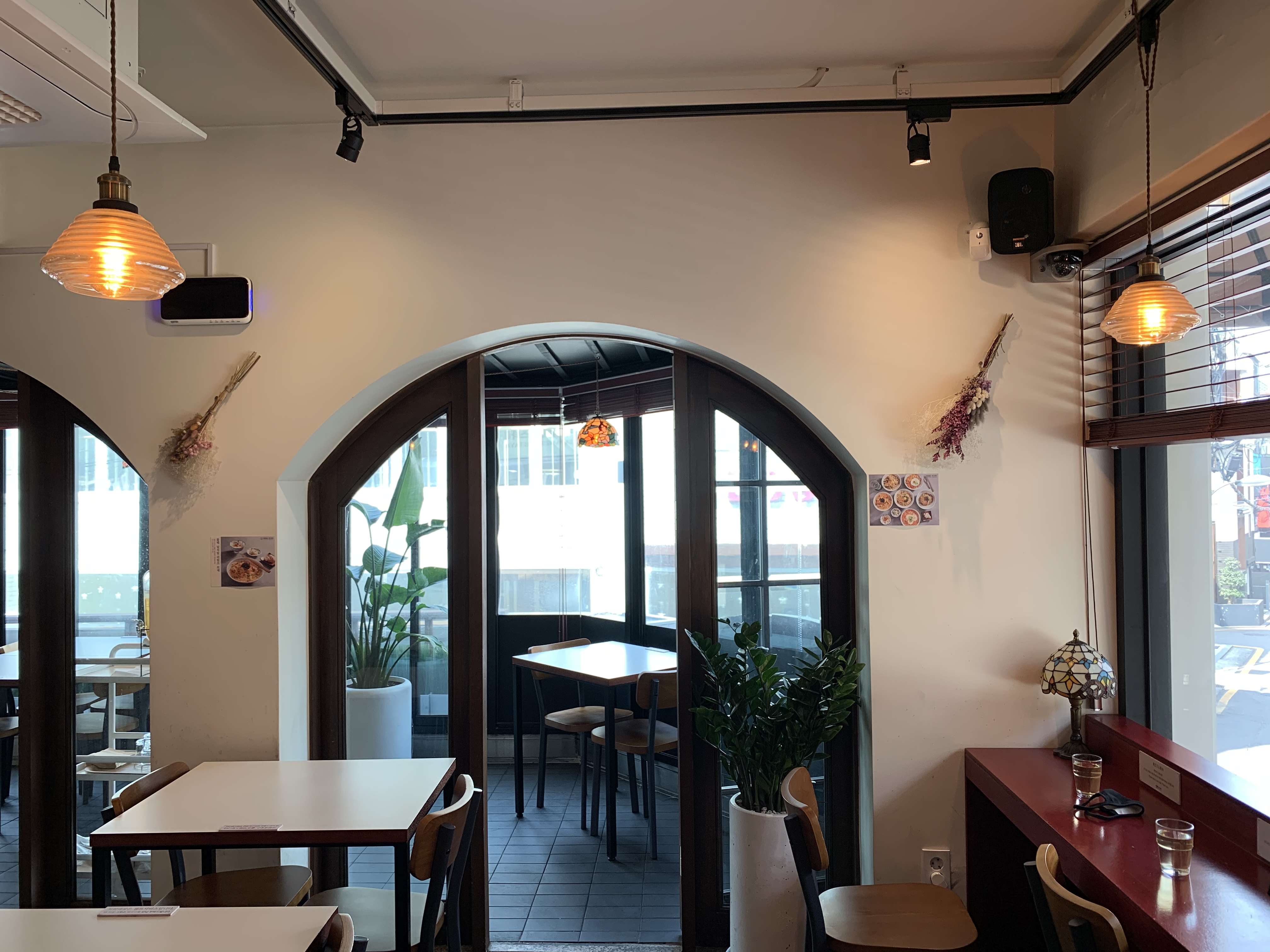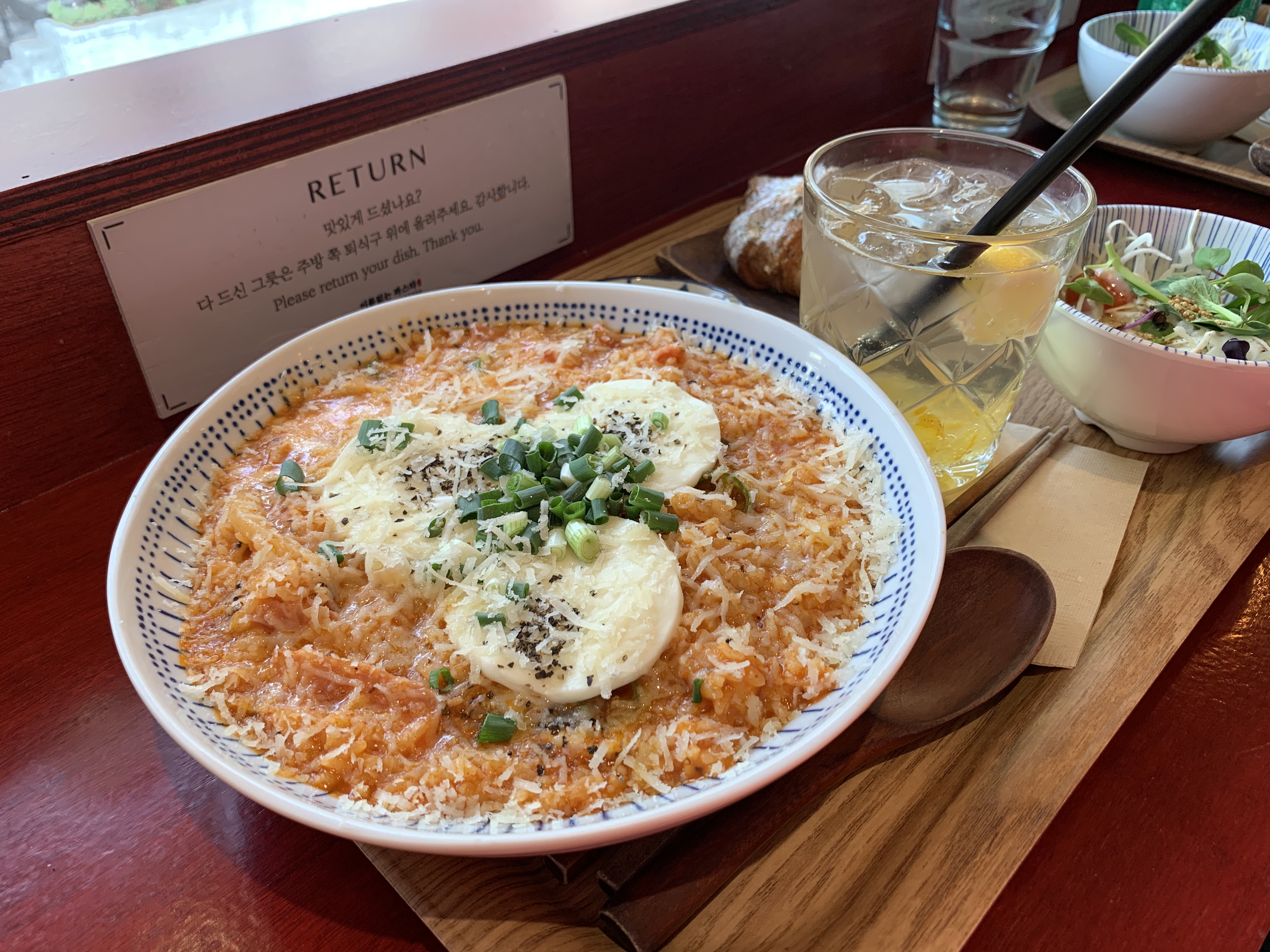 출입구에서 바로 오른쪽에 창밖을 바라볼 수 있는 붉은 바 자리가 있는데, 요즘 같이 햇볕 좋은 날에 제격이다. 키오스크에서 이미 주문을 했기 때문에 찻잎을 우린 물을 가져다 놓고 대기했다. 셀프서비스이기에 요리가 완료되면 키친 쪽으로 가지러 가면 된다.