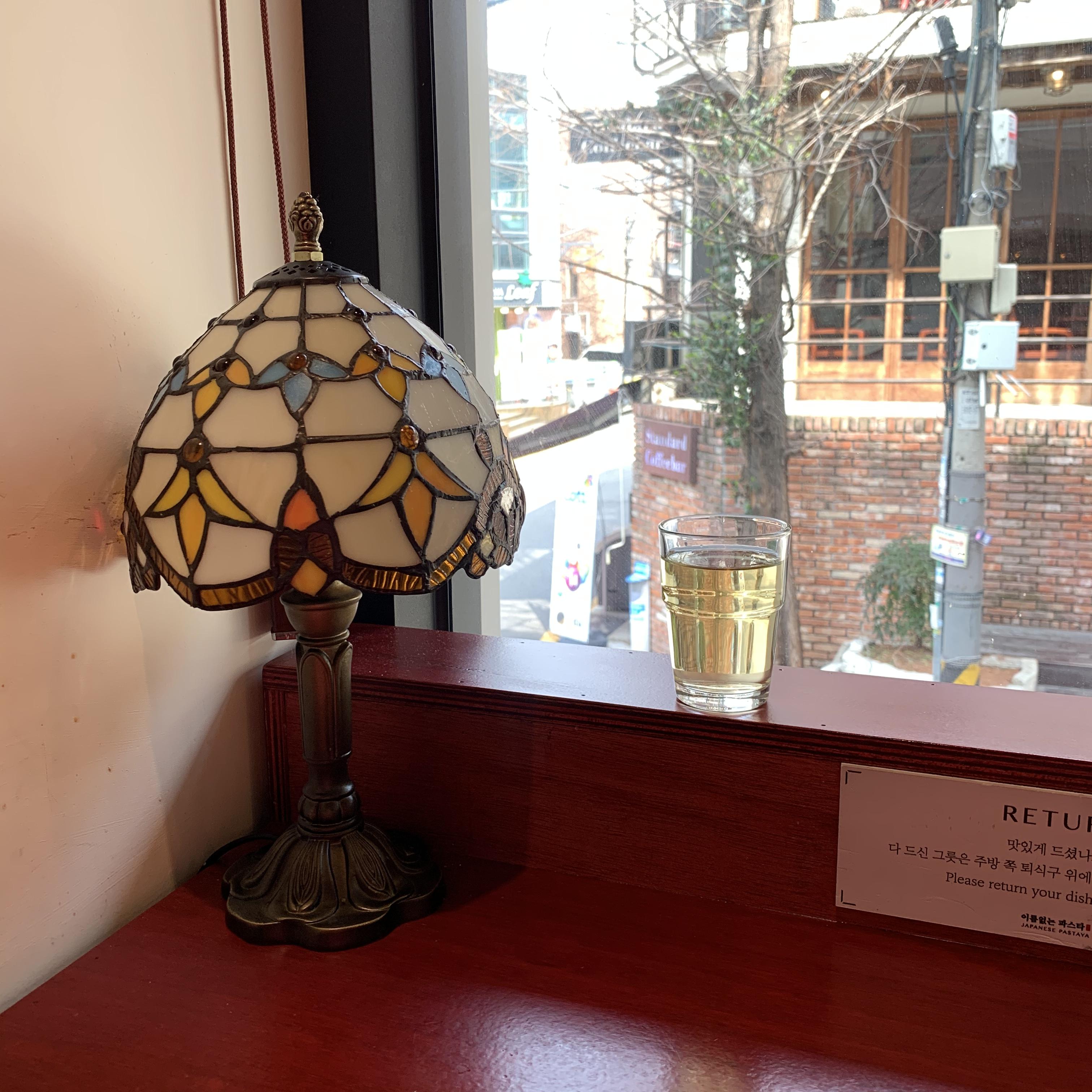 한쪽에 놓인 스테인드글라스 전등이 귀엽다. 받아 놓은 지 오래되어 보이는 물통에서 따른 기본 차가 의외로 맛도 좋고 굉장히 시원했다.