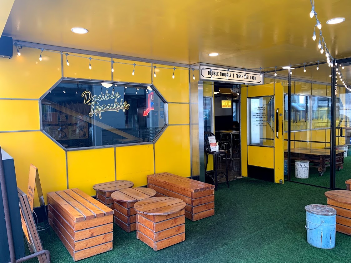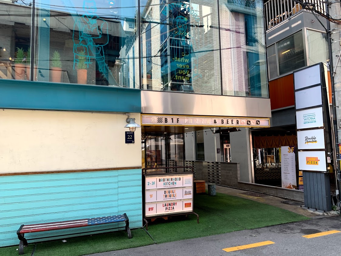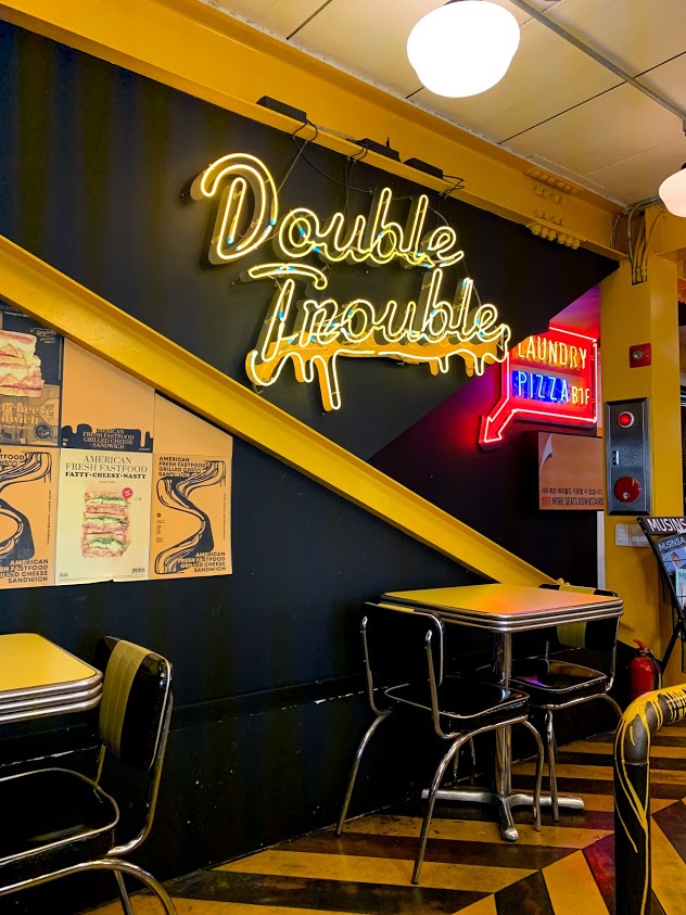 깨알 같은 직역체, #겹친문제 현판이 돋보이는 더블트러블 내벽. 가게가 좀 안쪽으로 들어와 있어서 못 찾을 수도 있는데, 유명한 라멘집 호랑이식당 바로 옆 건물에 이런 민트 외벽이 보이면 우측 차고 위치로 들어가면 된다.