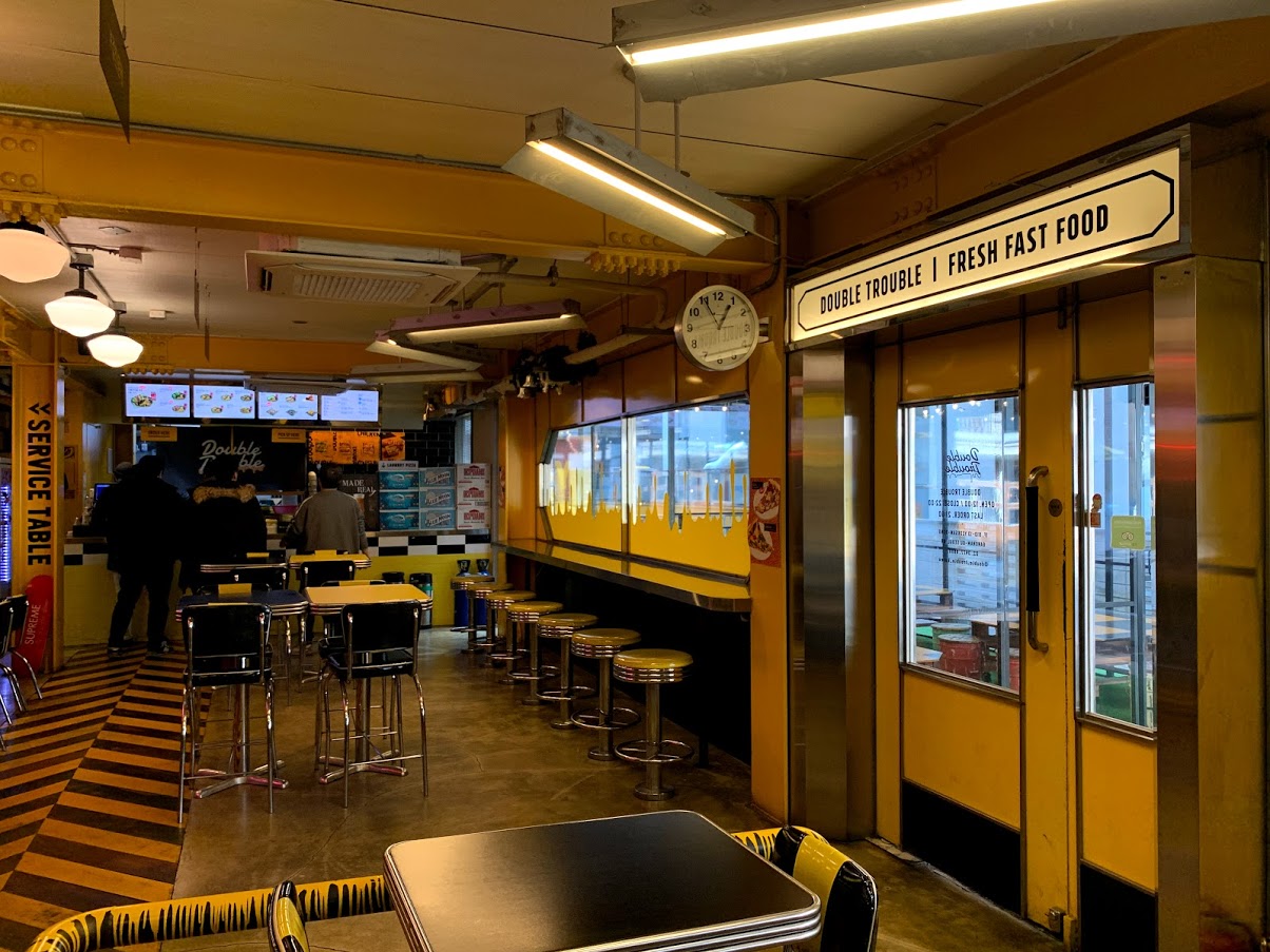 내부는 이런 느낌. 지하에도 매우 넓은 좌석이 구비되어 있다. 왜 노랗게 인테리어를 했는데도 어두울까...? 회사 근처인지라 매장에서 식사를 여러 번 했지만 아늑한 맛은 전혀 없는 더블트러블.