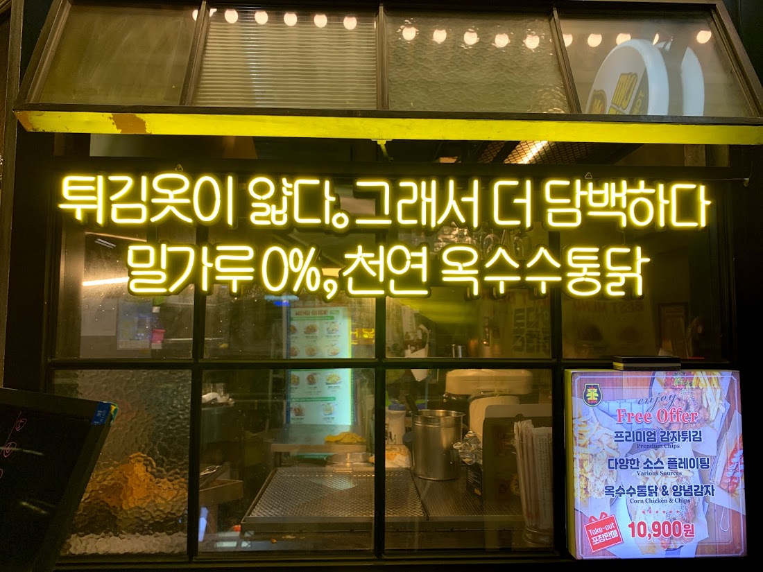 통닭도 살이 부드럽고 고소한 게 옥수수향이 확 난다. 튀김옷이 얇아 간이 안 맞지 않을까 걱정했는데 기우였다. (그러나 곧 그 걱정은 다음 메뉴에서 뒤통수를 치게 되는데...) 가게 밖에서 본 이 문구는 거짓이 아니었다.