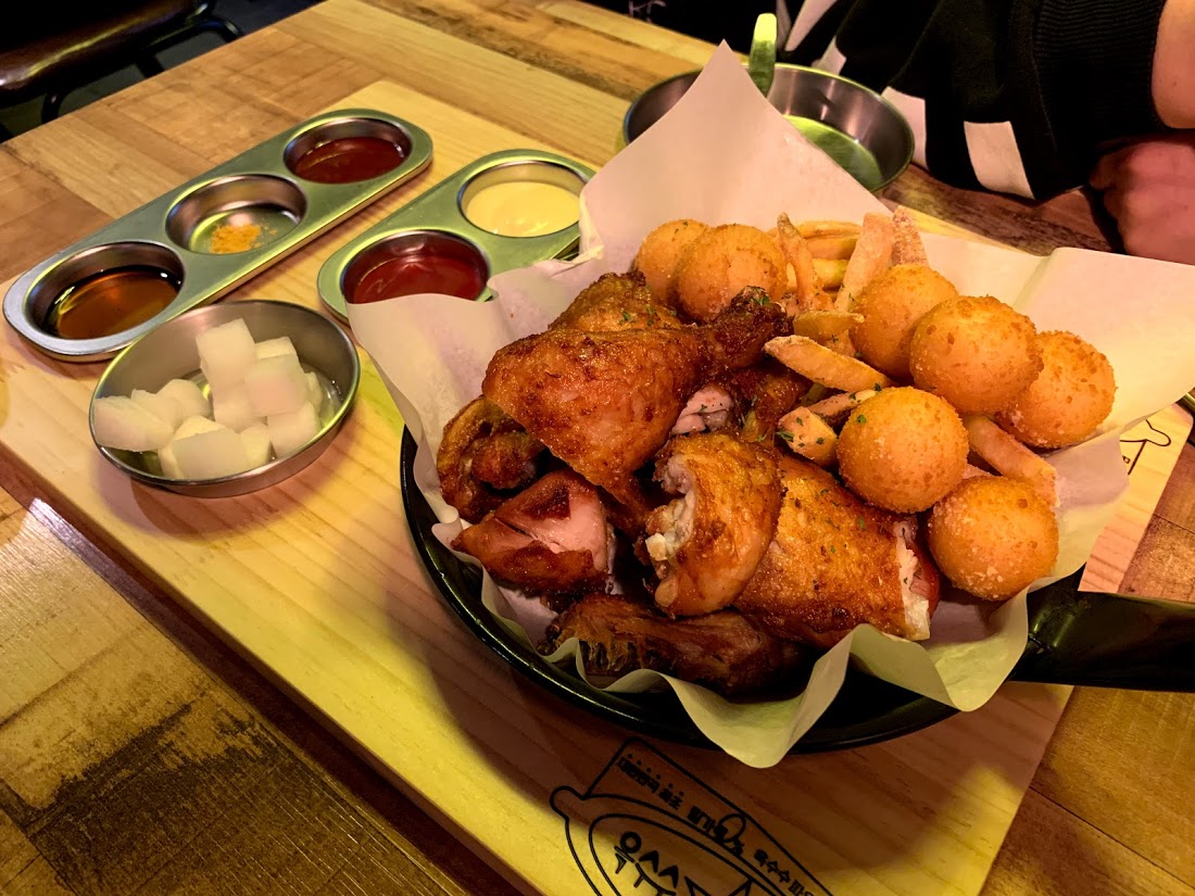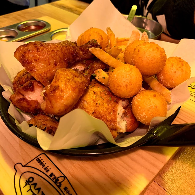 일단 기본 생맥주 한 잔을 주문하고, 이곳의 시그니쳐인 옥수수통닭을 시켰다. 양념 감자가 깔린 옥수수통닭이 13,900원이니 꽤나 저렴하다. 치즈볼도 하나 시켜 보았다.