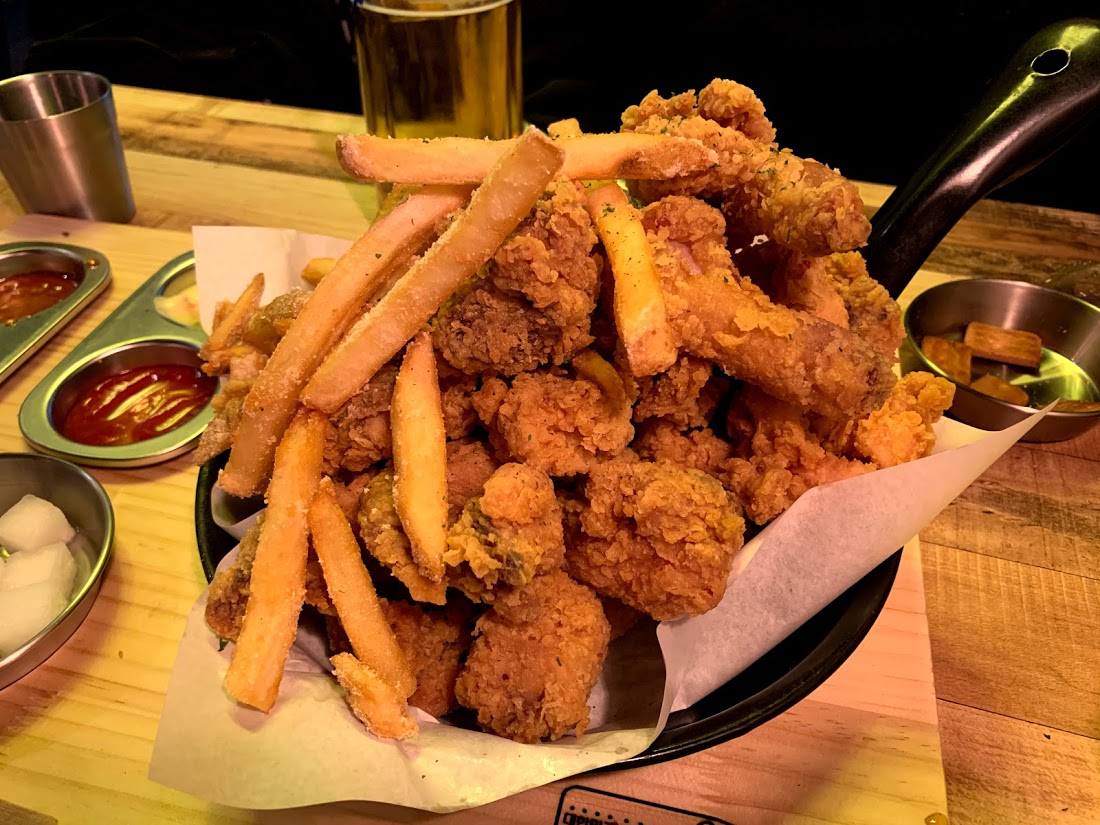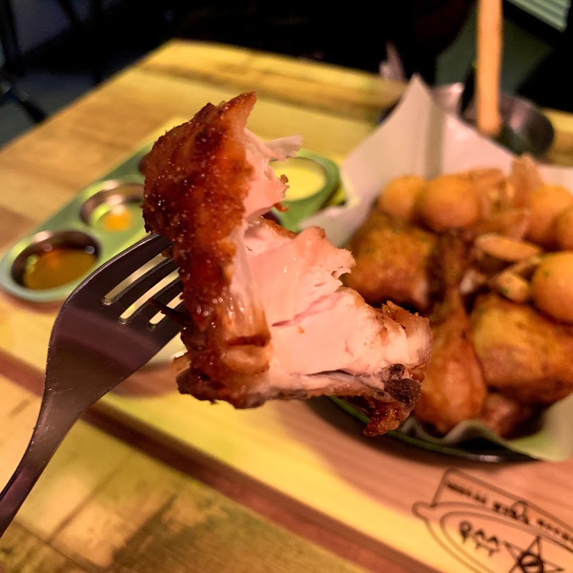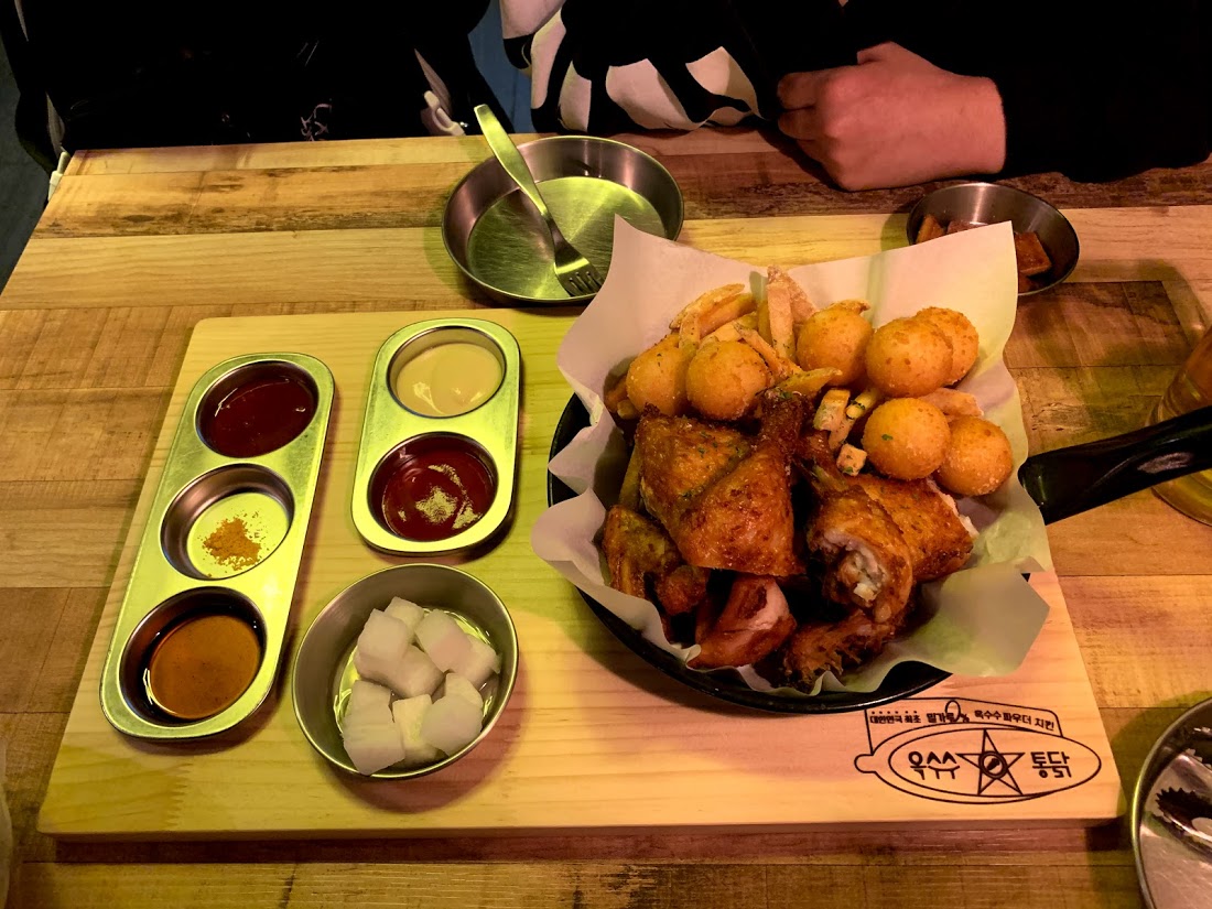 치즈볼도 그냥 한 군데 얹어서 나왔다. 팬과 소스 틀이 특이한데, 아예 맞춤 제작된 통닭왕 트레이로 고정되어 있어 한눈에 보기도 좋고 먹기 편했다. 다양한 특제 소스와 얇은 옥수수 가루 튀김옷이 잘 어울린다. 강남역 술집 통닭왕의 치킨에는 밀가루가 들어가지 않는다고 한다.