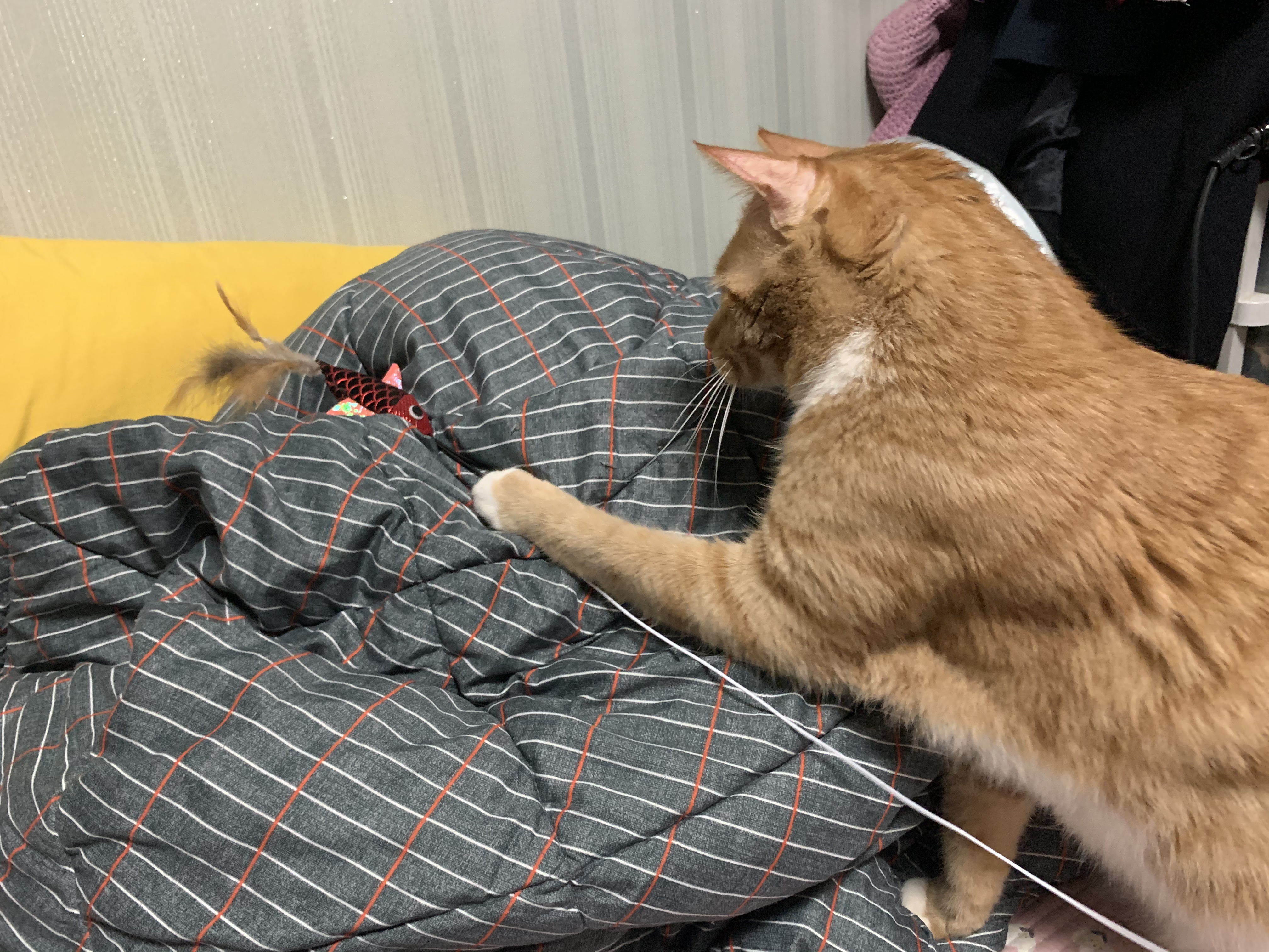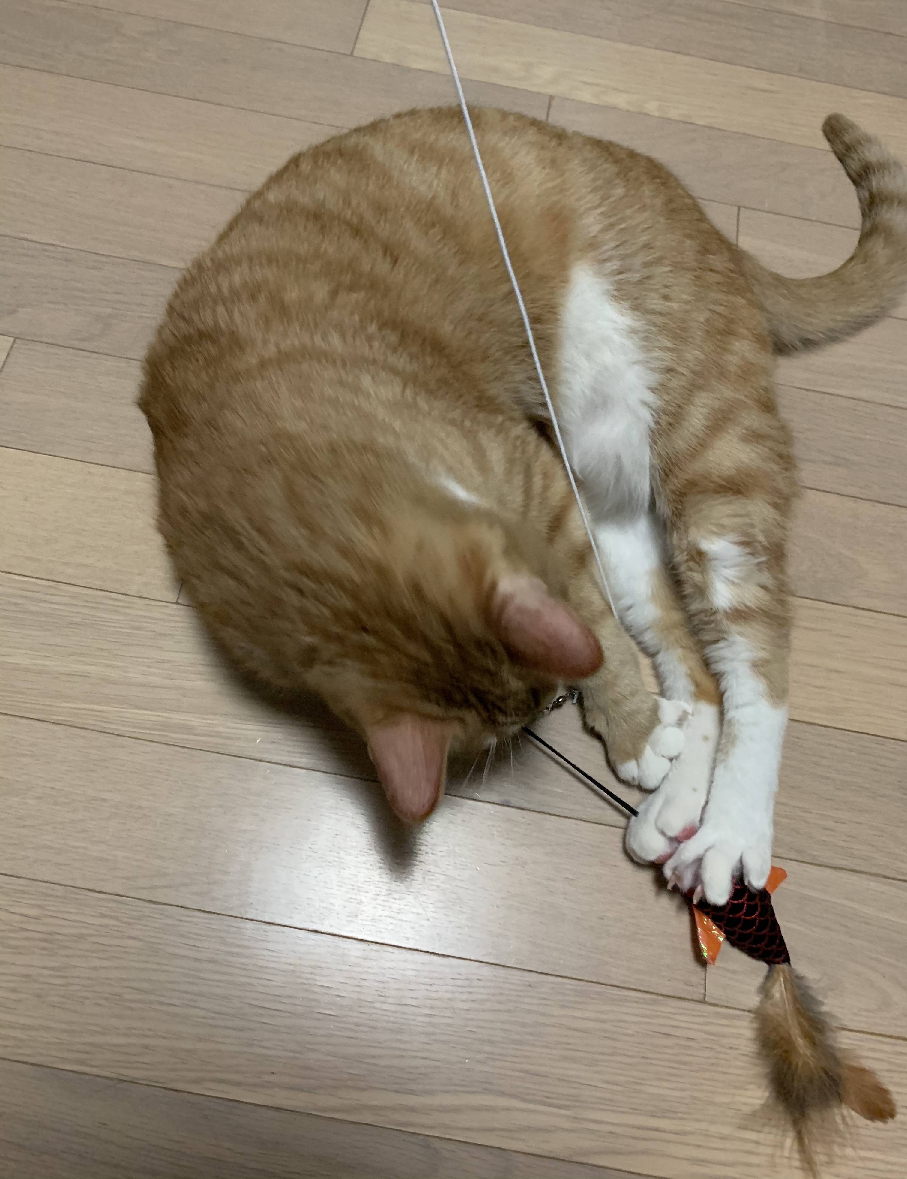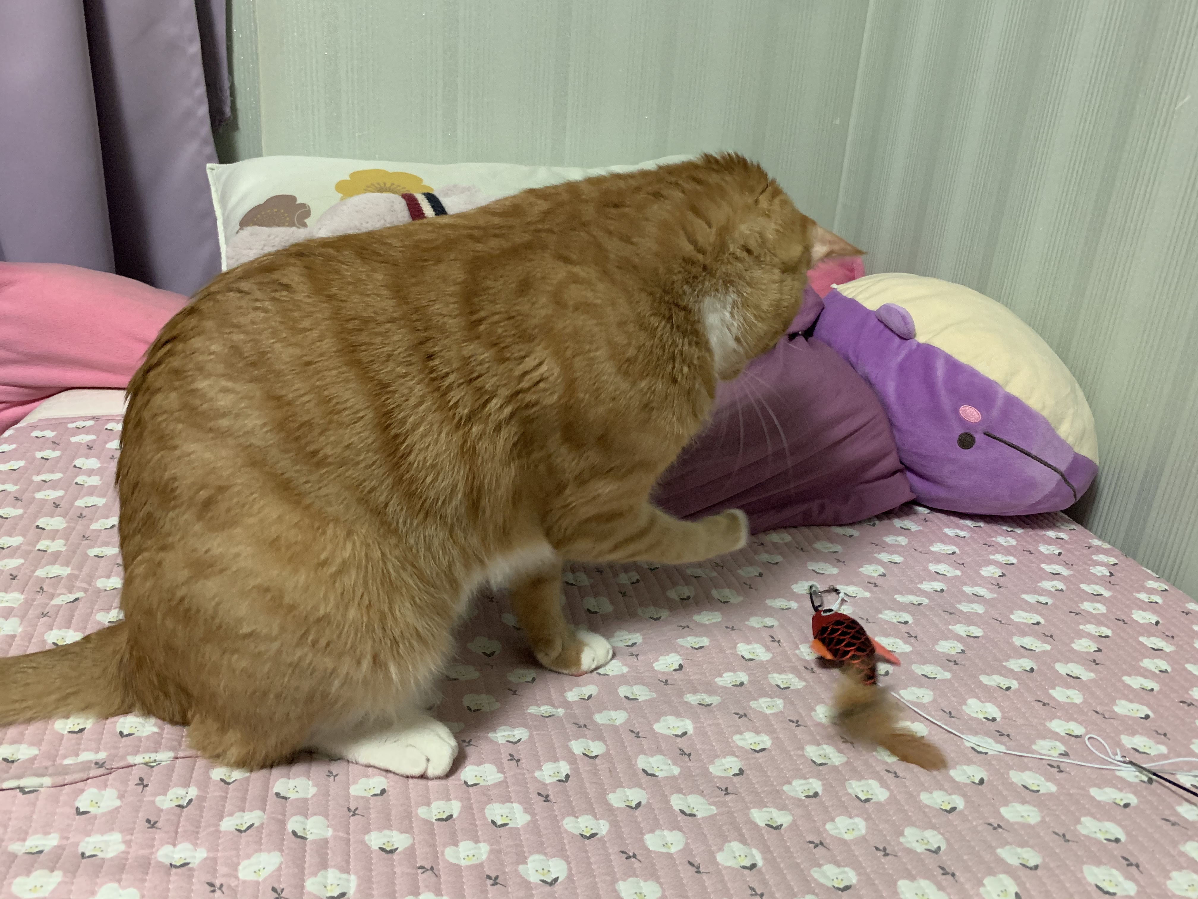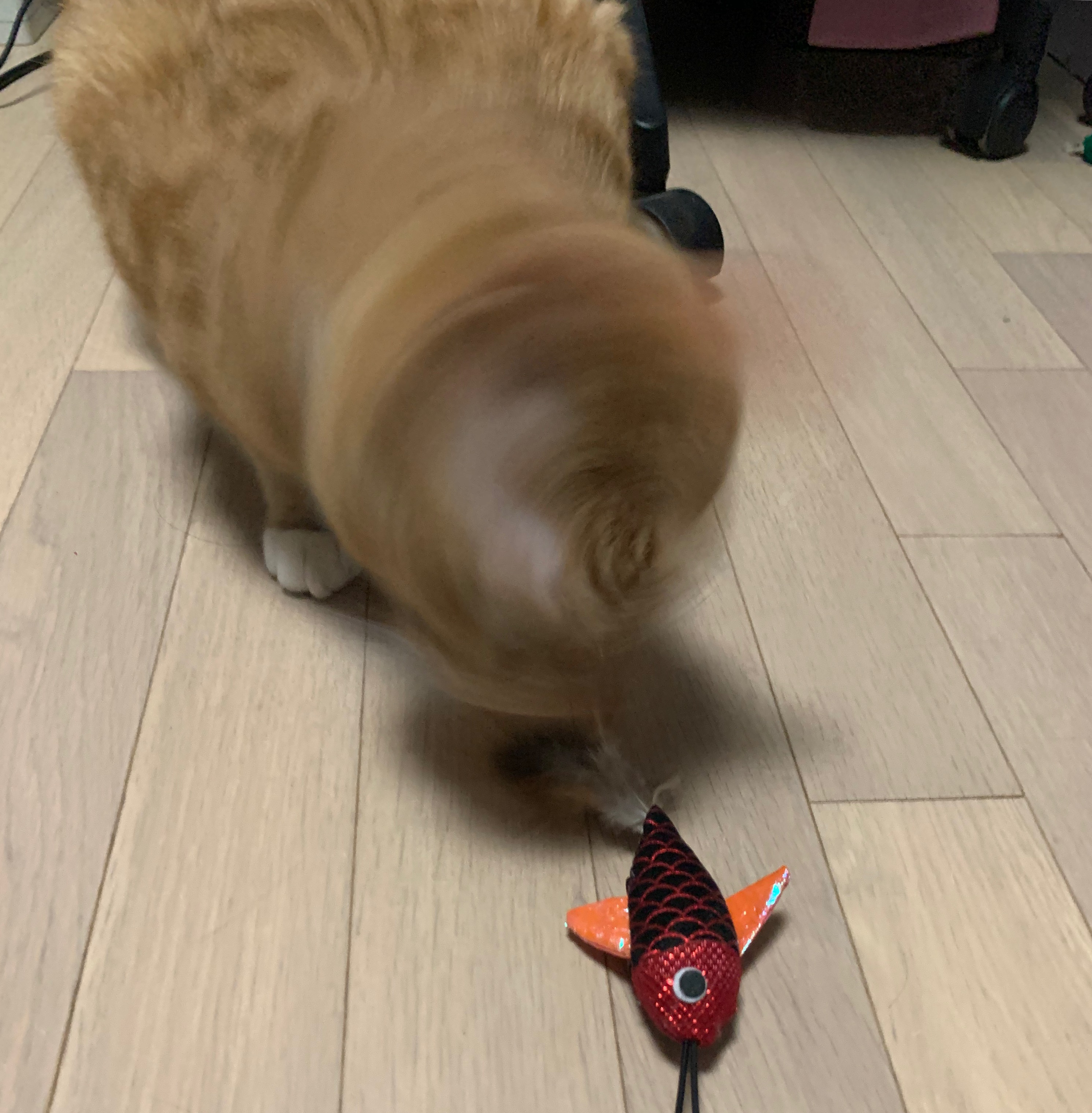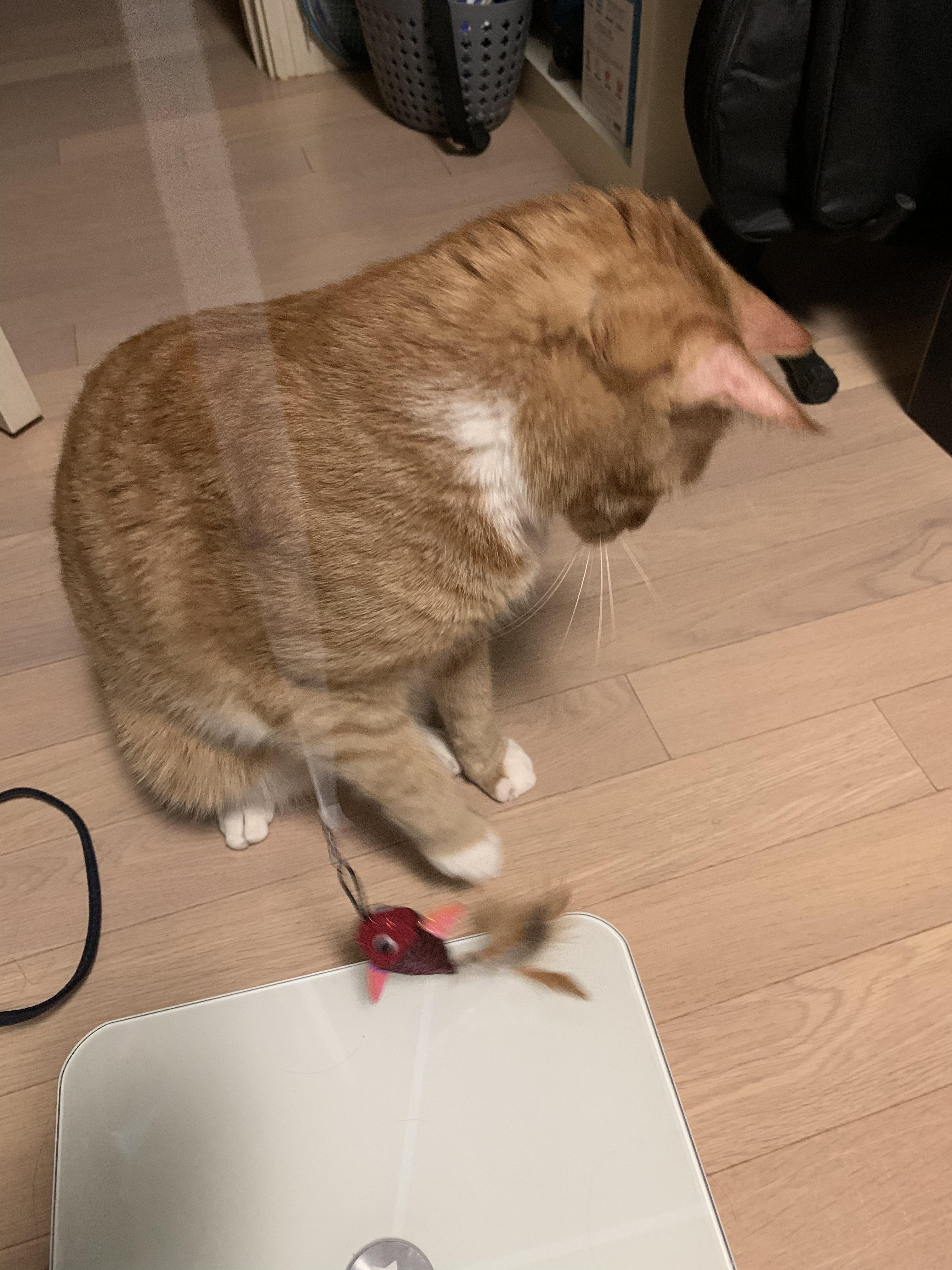 머리가 안보일 정도로 흔들어 제끼는 우리집 맹수 고양이 카이! 바닥에만 있으면 운동이 안되니 다이소 고양이 장난감으로 침대와 바닥을 오가며 뜀박질을 유도한다.