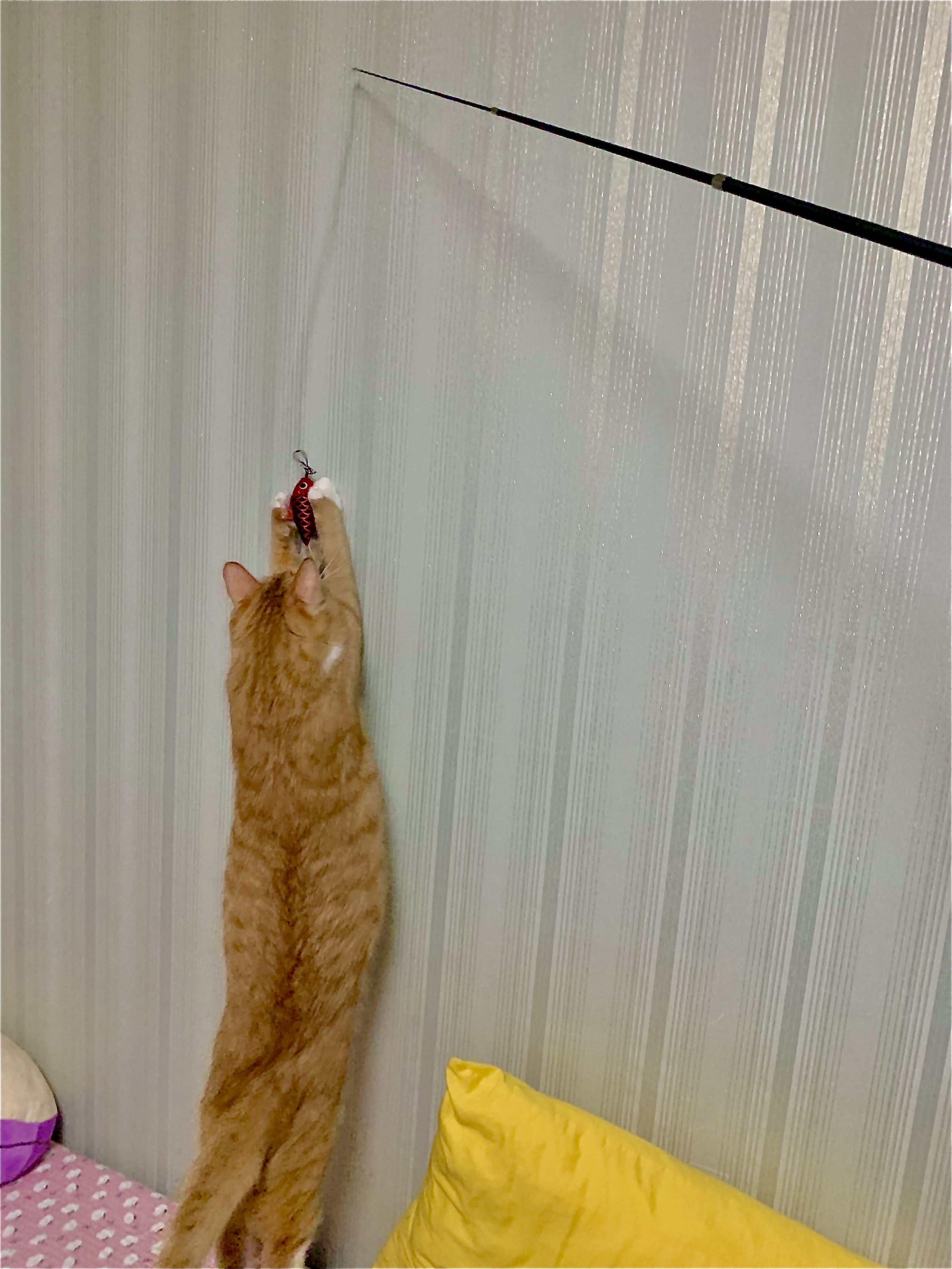 이렇게 쭈욱 늘리면 헙! 치즈도 쭉 늘어난다. (ㅋㅋㅋㅋ) 거대 치즈냥에게 너무나 좋은 다이소 고양이 장난감, 3단 고양이 낚싯대! 다이소 추천템으로 오래오래 생산되었으면 좋겠다.