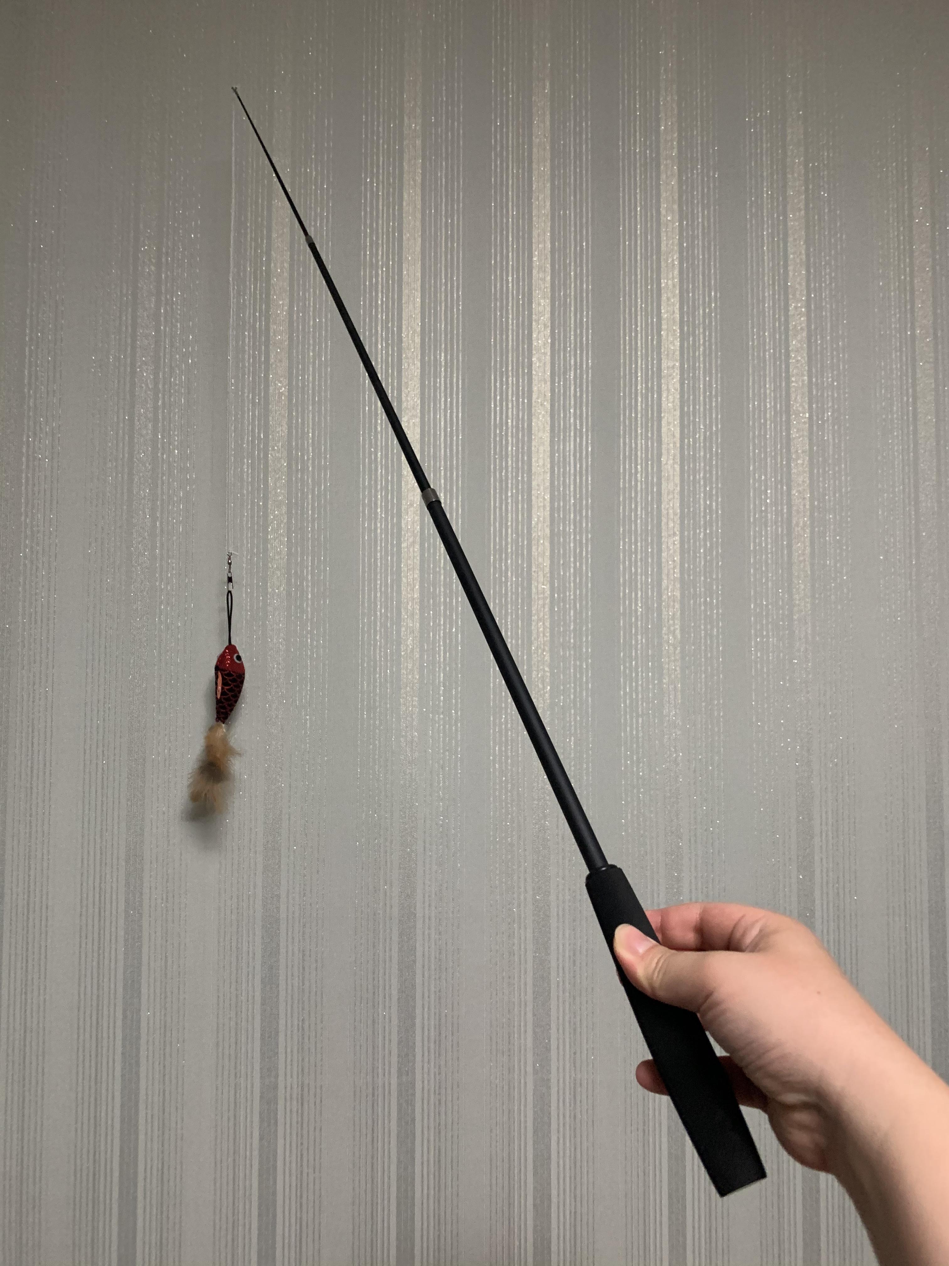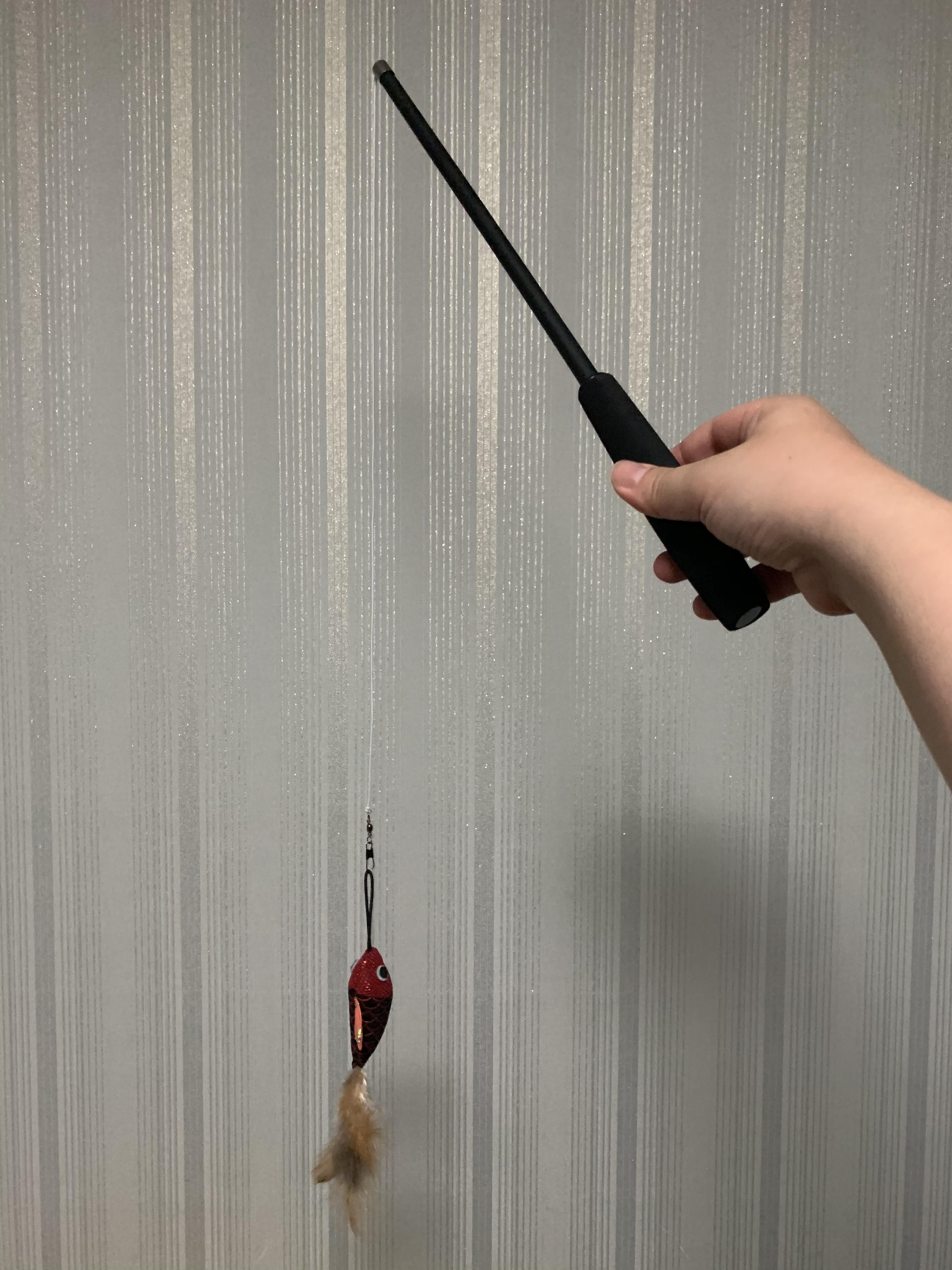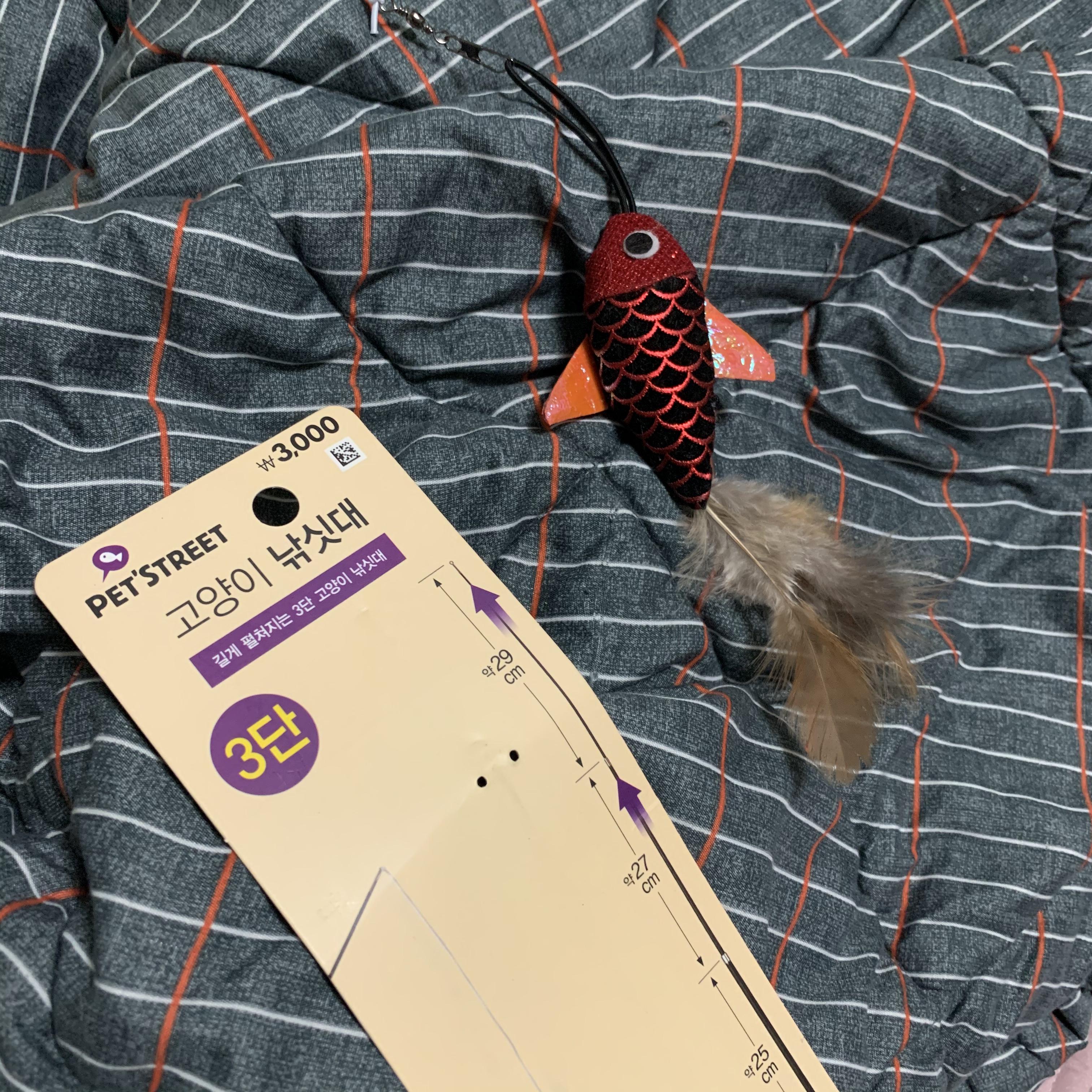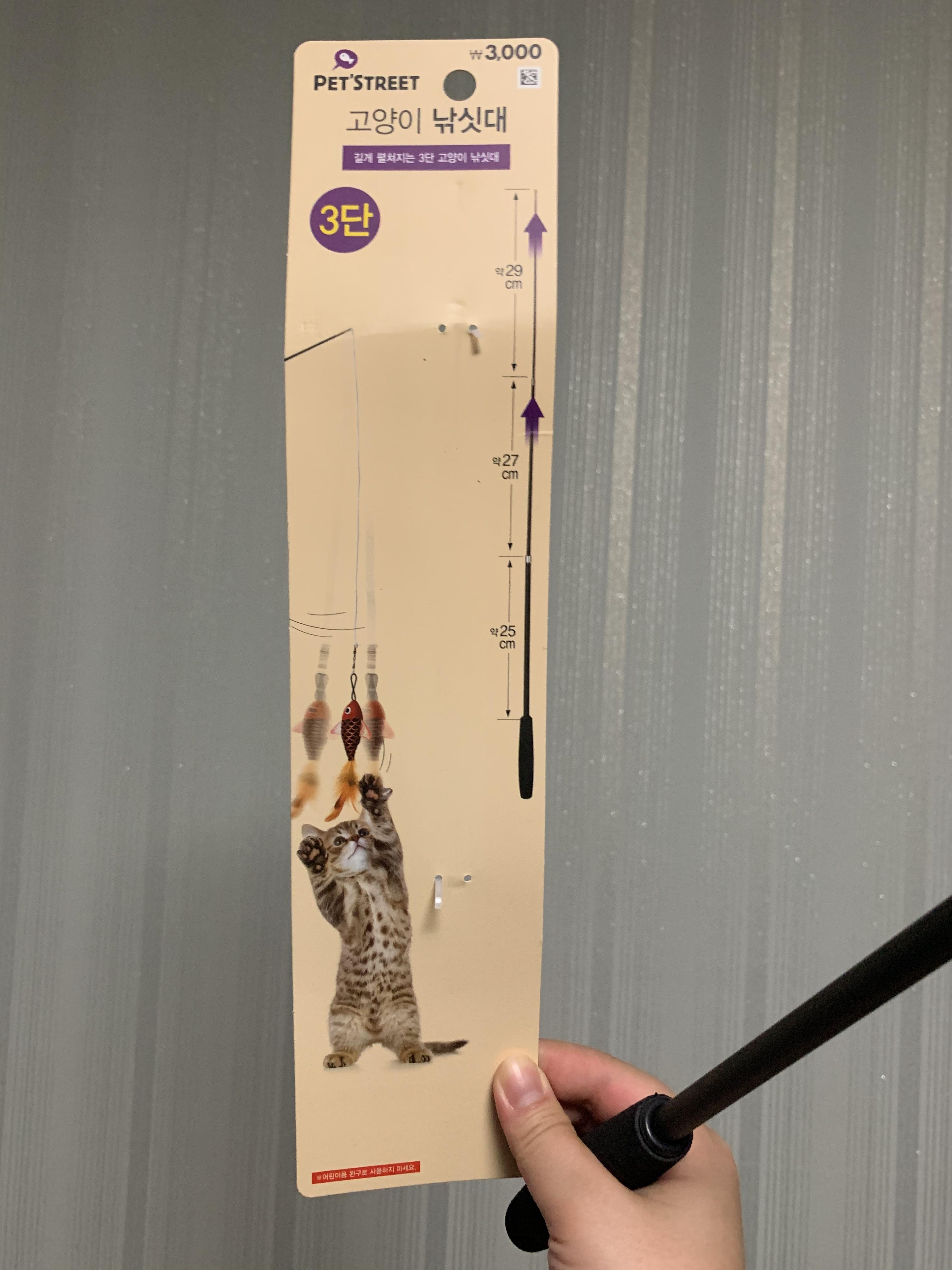 다이소 고양이 장난감 추천템! 바로바로 이 3000원 짜리 3단 고양이 낚싯대이다. 일반 천원짜리 낚싯대는 많이 사보았지만 당일에 망가져서 추천하기 어려웠는데, 이 1.5미터까지 늘어나는 3단 낚싯대 고양이 장난감은 끝부분의 탈부착형 고리가 튼튼해 물고기를 매단 끈이 끊어져도 쉽게 다른 사냥감을 교체하거나 다시 매듭을 지을 수 있다.